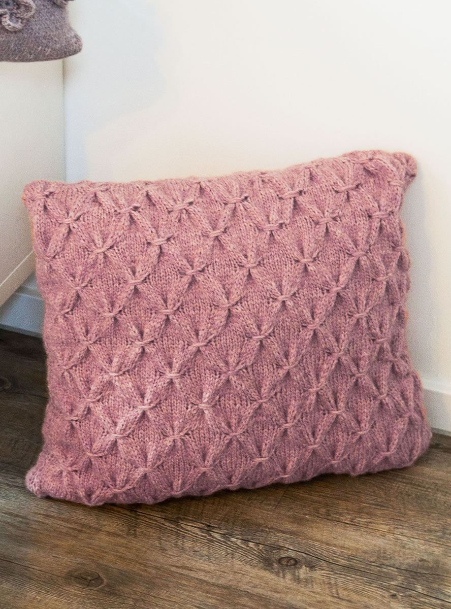 Lana Grossa-kvalitet „Alta Moda Alpaca“ (90 % (baby) alpaka, 5 % ren ny uld (merino), 5 % polyamid, l.bel.ngde = ca. 140 m / 50 gr.): ca. 300 gr. rosa meleret (fv. 45), strikkepinde nr. 6, 1 vaskbar fyldpude p. 45 x 45 cm.