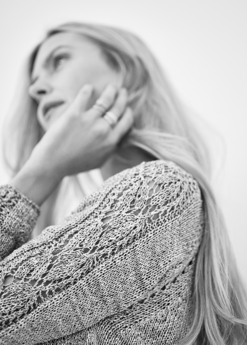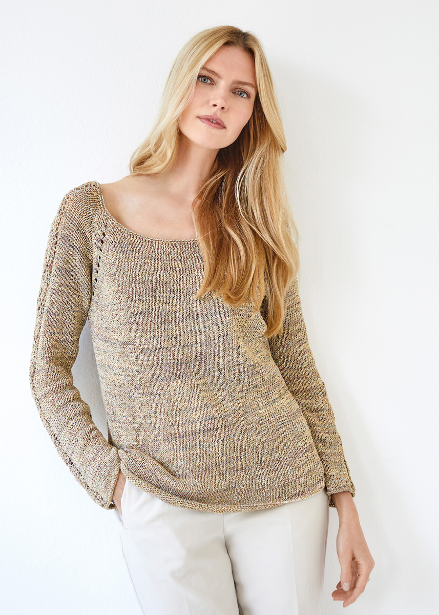 Lana Grossa-kvalitet ”Alessia” (76 % bomuld, 20 % rec. polyester, 4 % polyester, løbelængde = ca. 135 m / 50 gr.): ca. 450(500-550) gr gylden/lysegrå/gråbrun (fv 4), strikkepinde nr. 4½, rundpind nr. 3½, 40 cm.