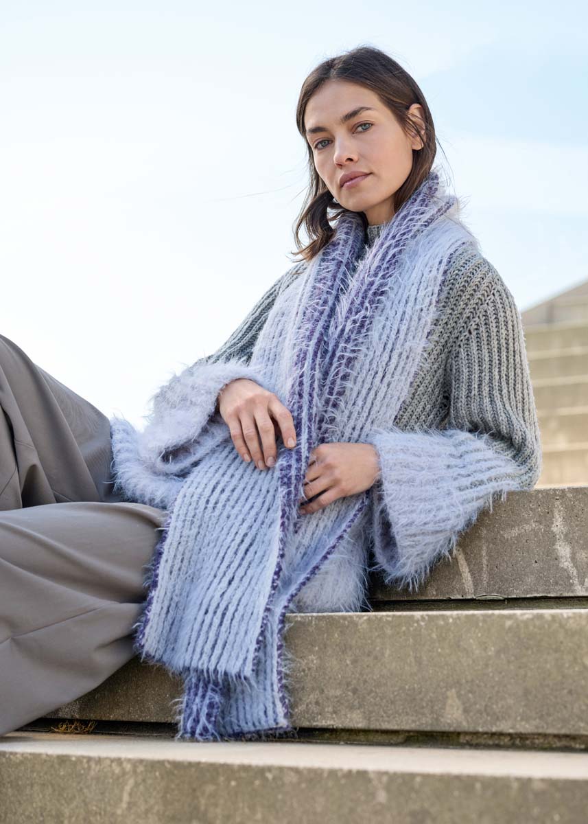 Lana Grossa-kvalitet „Basta“ (50 % ren ny ull (merino ), 50 % polyamid, løpelengde = ca 100 m/50 g): 200 (200 - 250 - 250) g sølvgrå (farge 4), Lana Grossa-kvalitet „Cool Merino“ (90 % ren ny ull (merino ), 10 % polyamid, løpelengde = ca 150 m/50 g): 300 (350 - 350 - 400) g lysgrå (farge 13); strikkepinner nr. 6, 6,5 og 7; 1 kort rundpinne nr. 5,5.