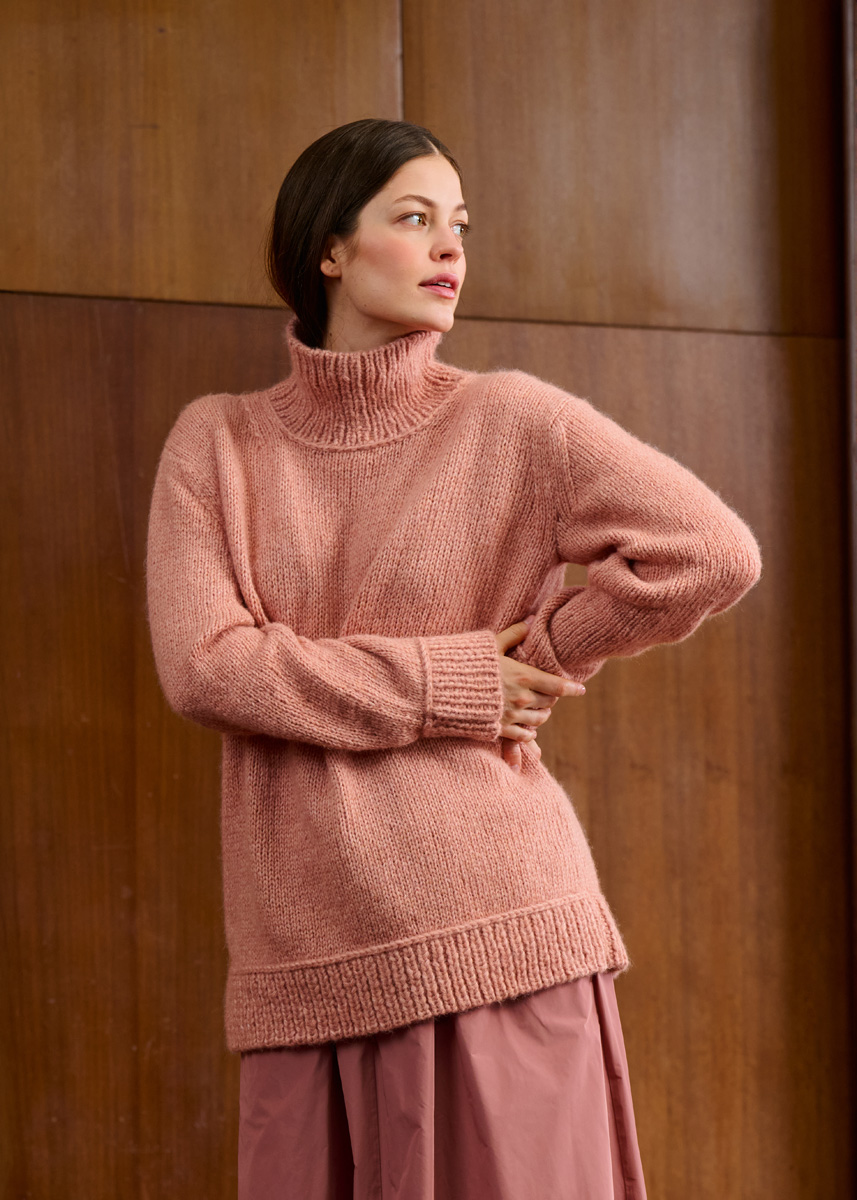 Lana Grossa Brigitte No. 2 (47% alpakka (baby), 45% bomull, 8% ren ny ull (merino ), løpelengde 140 m/50 g), 500 (550 – 600) g fersken (farge 55); strikkepinner nr. 6 og 6,5, såvel som 1 strømpepinnesett nr. 6 og 6,5. TIPS: Kun vrangbordkantene og kragen strikkes med dobbel tråd!