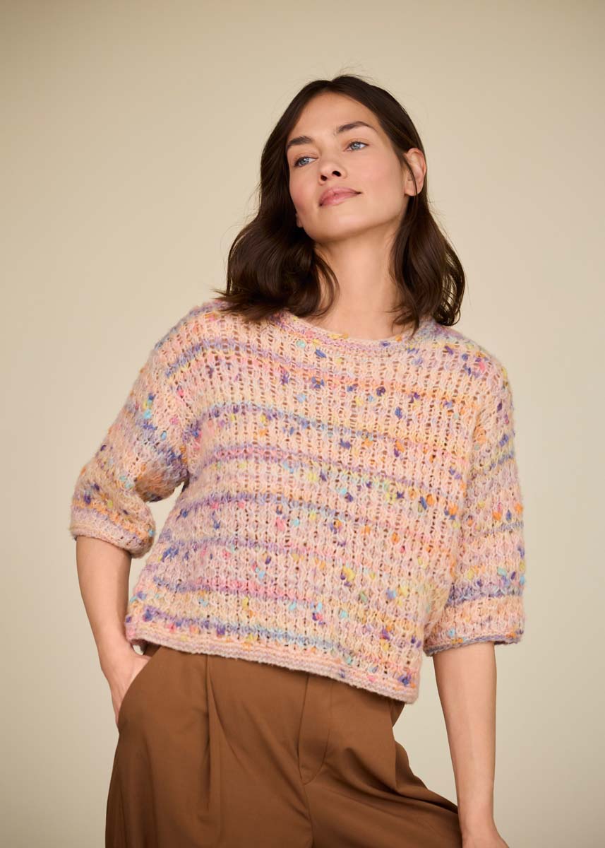 Lana Grossa „Cassata“ garn (54% jomfruuld (ekstrafin merinould), 30% polyamid, 16% bomuld, LL = ca. 175 m/50 g): 150 (200 - 200 - 250) g Fersken/Blå/Gul/Orange/ Lilla (fv 1); strikkepinde 4,5 og 6 mm; 1 kort rundpind 4,5 mm