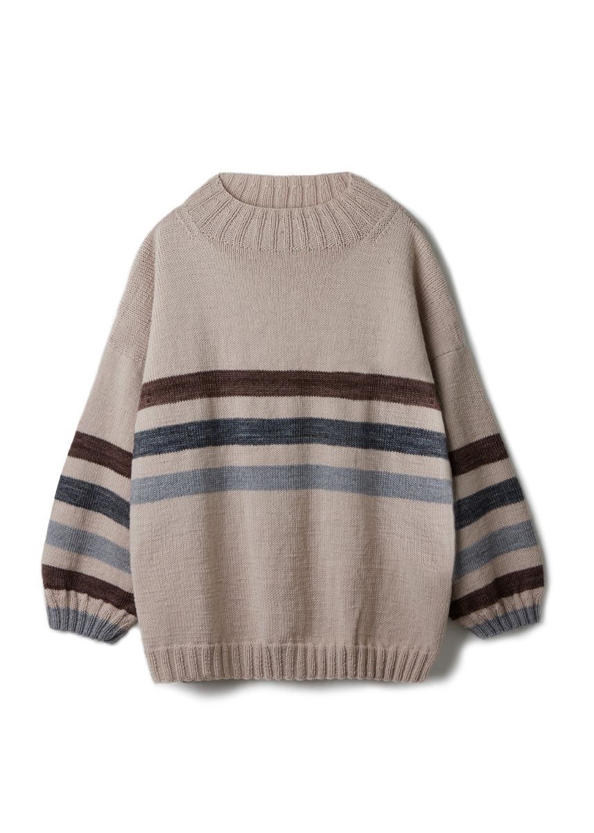 Materiale: Lana Grossa Cool Wool (100% ren ny uld (ekstrafin merino), LL = ca. 160 m/50 g), 450 (500 - 550 - 600) g i perlebeige (farve 2114). Lana Grossa Cool Wool Vintage (100% ren ny uld (ekstrafin merino), LL = ca. 160 m/50 g), 50 g af hver i lysegrå (farve 7369), mørkebrun (farve 7384) og mørkegrå (farve 7391). En rundpind på 50 cm og en på 80 cm, størrelse 3 mm; en rundpind på 80 cm, størrelse 3,5 mm. 3 sæt hjælpepinde som maskeholdere.