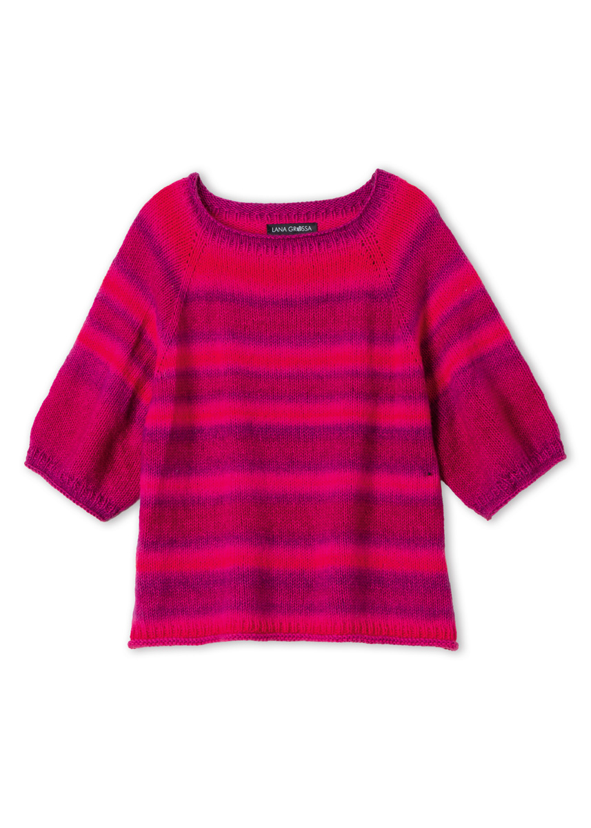 Lana Grossa-kvalitet „Corallo“ (70 % bomull (bio), 30 % ren ny ull (merino), løpelengde = ca 210 m/100 g): ca 400 (400 - 500 - 500) g rødviolett/fuchsia/pink (farge 4); kort og lange rundpinne nr. 4, nr. 4,5 og nr. 5; strømpepinner nr. 4, nr. 4,5 og nr. 5; maskemarkører. Genseren strikkes ovenfra og ned i ett stykke.