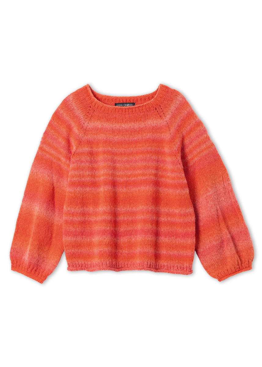 Lana Grossa-kvalitet „Corallo“ (70 % bomull (bio), 30 % ren ny ull (merino), løpelengde = ca 210 m/100 g): ca 500 (500 - 600 - 600) g bringebær/rød (farge 2); kort og lange rundpinne nr. 4, nr. 4,5 og nr. 5; strømpepinner nr. 4, nr. 4,5 og nr. 5; maskemarkører. Genseren strikkes ovenfra og ned i ett stykke