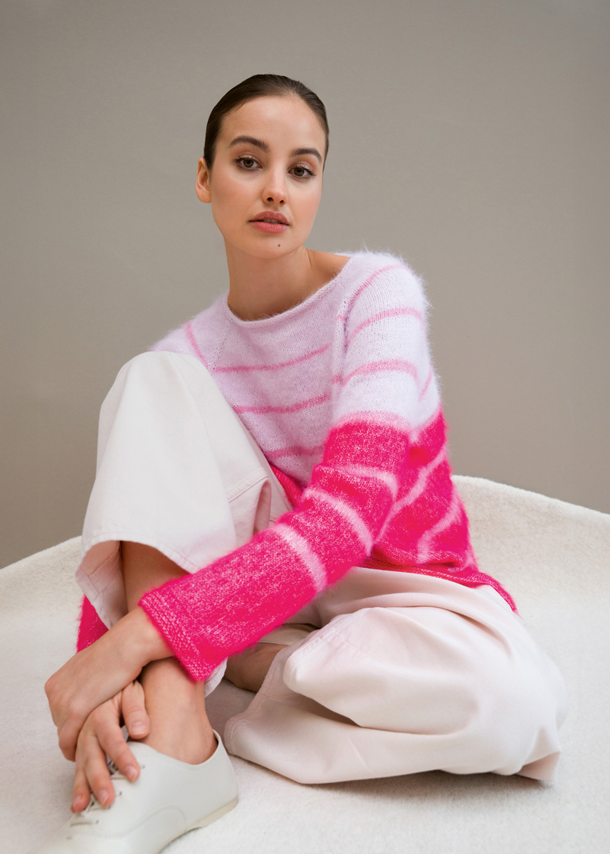 Lana Grossa Finito (73 % bomull, 27 % polyamid, løpelengde 150 m/50 g), 150 (150 – 200 – 200) g syrinrosa/creme (farge 17), 100 (100 – 150 – 150) g pastellpink/creme (farge 18), 250 (250 – 300 – 300) g bonbonrosa/creme (farge 19); rundpinne nr. 4, lengde 60-100 cm; 8 maskemarkører [MM].