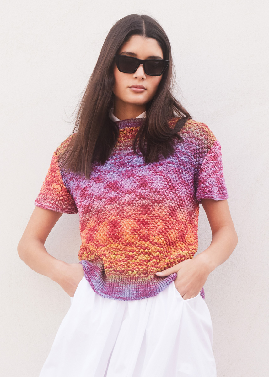 Lana Grossa-kvalitet „Gomitolo Baleno“ (80 % bomull, 20 % polyamid, löplängd = ca 370 m/100 g): 3 (4 - 4 - 5) nystan = ca 300 (400 - 400 - 500) g bordeaux/laxrosa/blekrosa/blålila/ grå (färg 222); stickor nr. 2,5 och nr. 3; 1 kort rundsticka nr. 2,5.