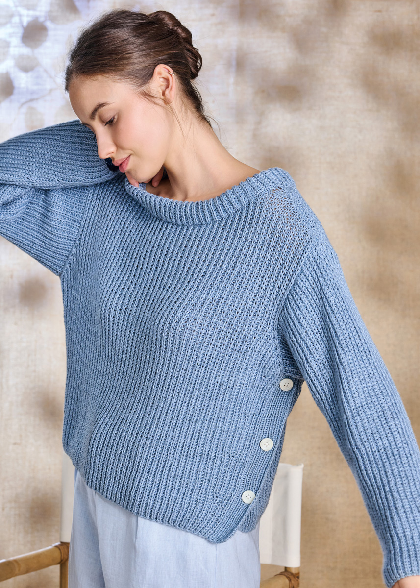 Lana Grossa-Kvalitet Linarte (40% viskose, 30% bomuld, 20% hør, 10% polyamid, løbelængde 125 m/50 g), 700 (750 – 800) g gråblå (farve 76); strikkepinde nr. 4½ samt rundpind nr. 4½, 40 cm, og 3 knapper fra UNION KNOPF, perlemor, 20 mm Ø.