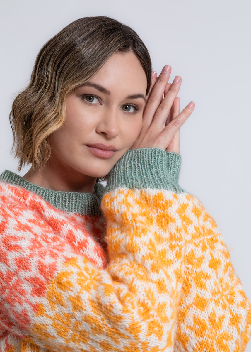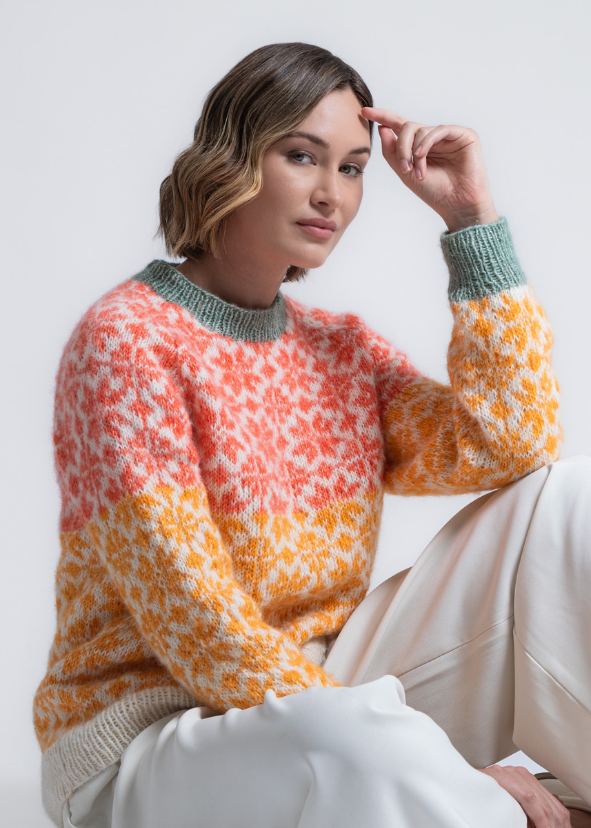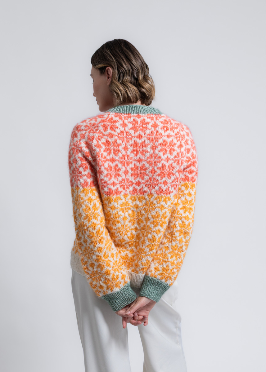 Rygg- og forstykke strikkes rundt fram til ærmegabene, og derefter afslutes de separat. Ærmerne strikkes også rundt fram til raglanskråningen. Modellen har en samlet længde på 61 (63 - 65 - 67 - 69 - 71) cm og har en brystvidde som er 15 cm større end en brystomkreds på 80 cm (16 cm større end en brystomkreds på 88 cm - 8 cm større end en brystomkreds på 96 cm - 10 cm større end en brystomkreds på 104 cm - 7 cm større end en brystomkreds på 116 cm - 5 cm større end en brystomkreds på 128 cm).