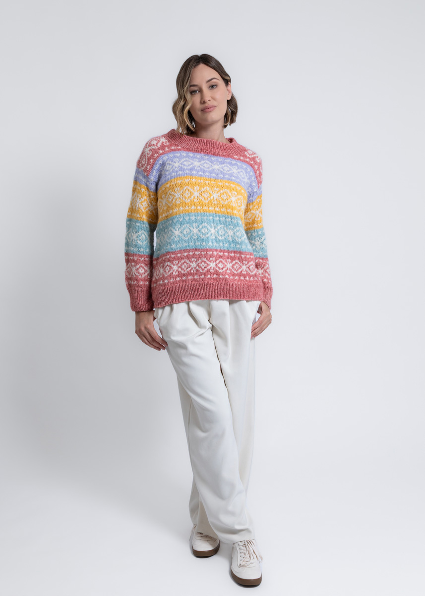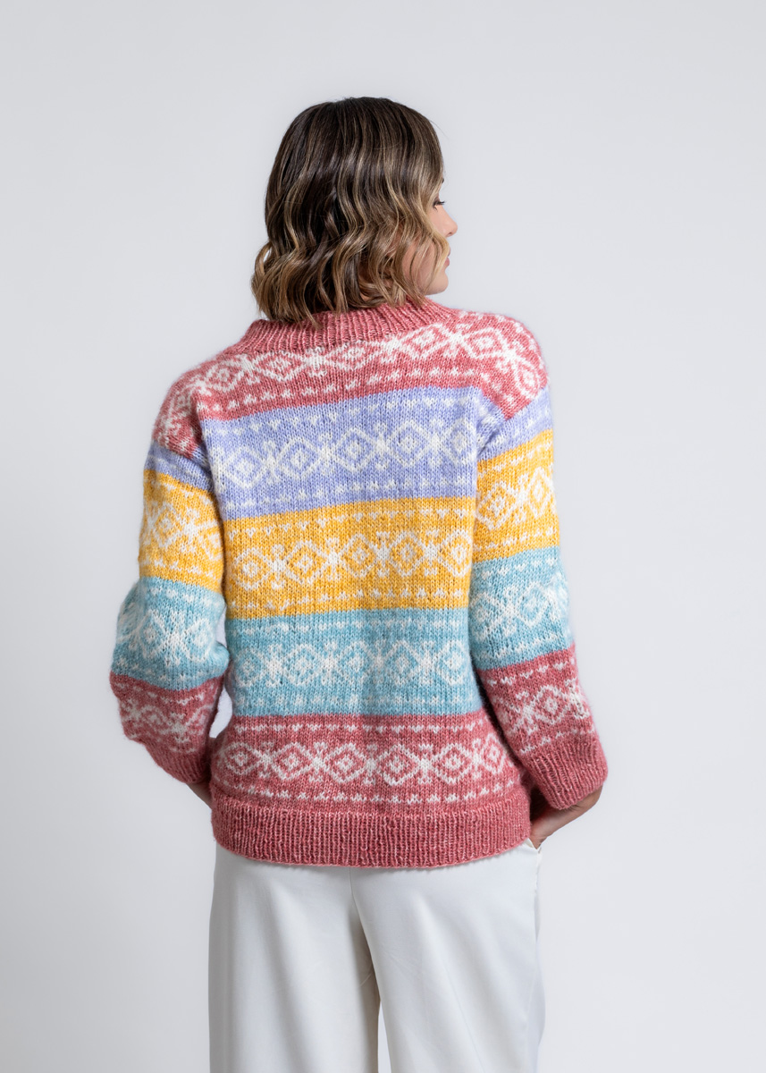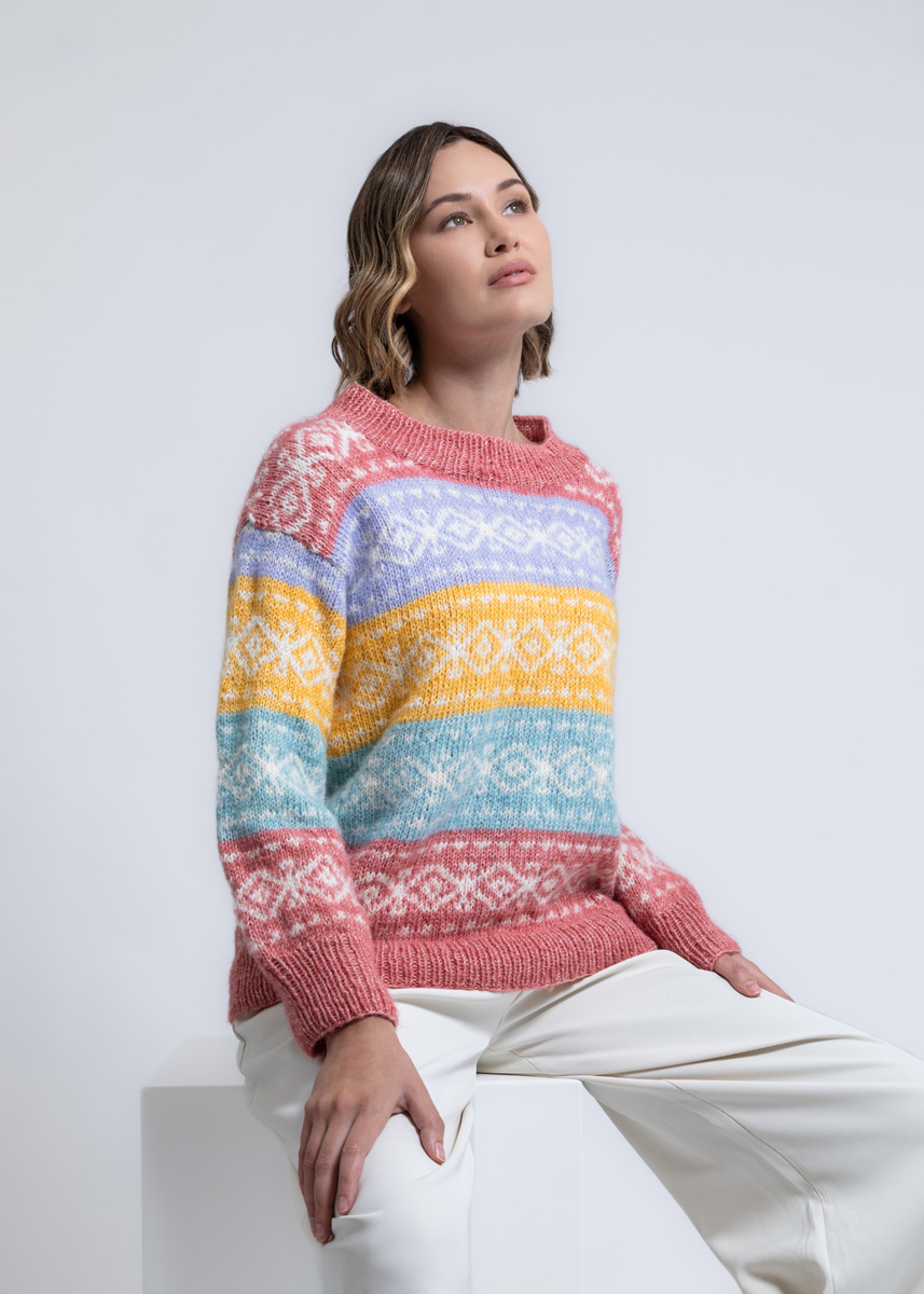 Pulloveren wird fra unten efter oben og til zu den Armausschnitten rundt gestrikkt. Modellen har en samlet længde på 60 (62 - 64 - 66 - 68 - 70) cm og har en brystvidde som er 14 cm større end en brystomkreds på 80 cm (12 cm større end en brystomkreds på 88 cm - 10 cm større end en brystomkreds på 96 cm - 16 cm større end en brystomkreds på 104 cm - 10 cm større end en brystomkreds på 116 cm - 10 cm større end en brystomkreds på 128 cm).