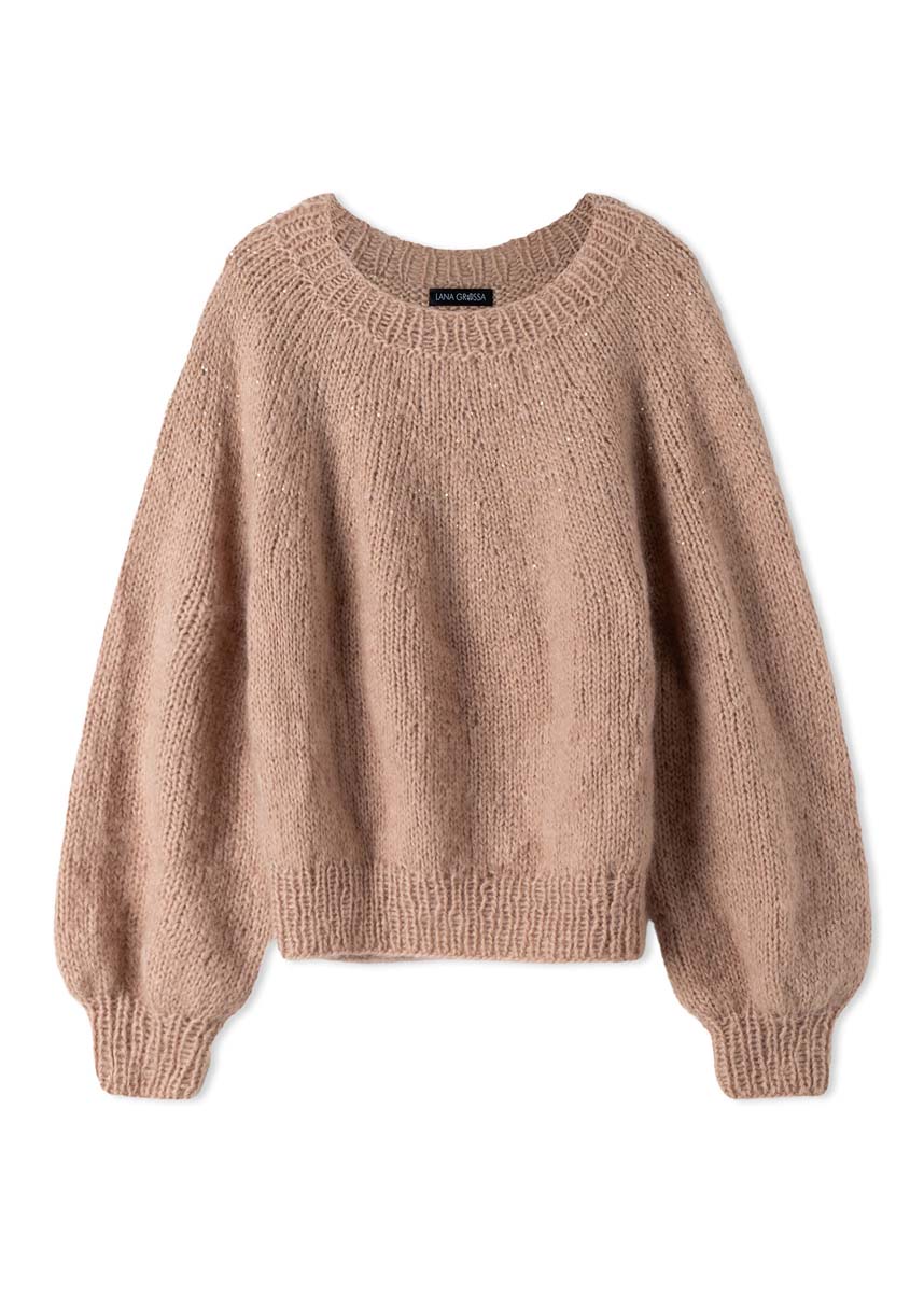 Lana Grossa Mohair di Gio (55% mohair (superkid), 45% ren ny ull (merino superfin), løpelengde = ca. 85 m/50 g), 500 (550 - 600) g i beige (farge 8) og Lana Grossa Glamour (55% polyacryl, 45% polyester, løpelengde = ca. 112 m/50 g), 25 g i beige (farge 10); 60 cm og 100 cm lange rundpinner og settpinner nr. 7; 50 cm, 80 cm, 100 cm og 120 cm lange rundpinne nr. 8; 4maskemarkører (MM); 2 hjelpepinne til hvilende m