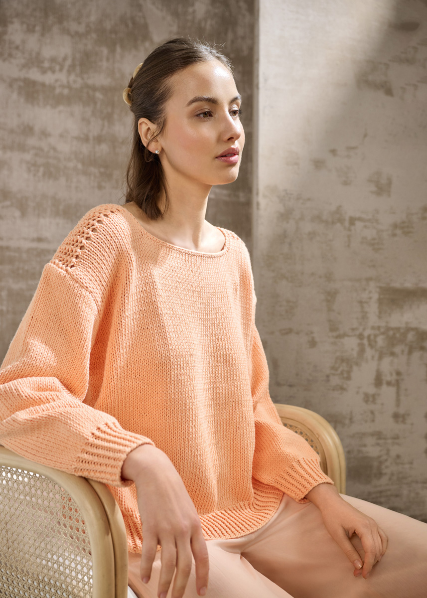 Lana Grossa-Kvalitet Natural Cotton (100% bomuld (økologisk), løbelængde 80 m/50 g), 650 (700 – 750) g abrikos (farve 23); strikkepinde nr. 5 og 5½ samt hæklenål nr. 4½.