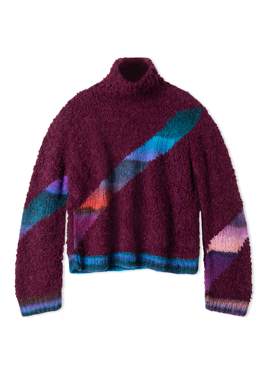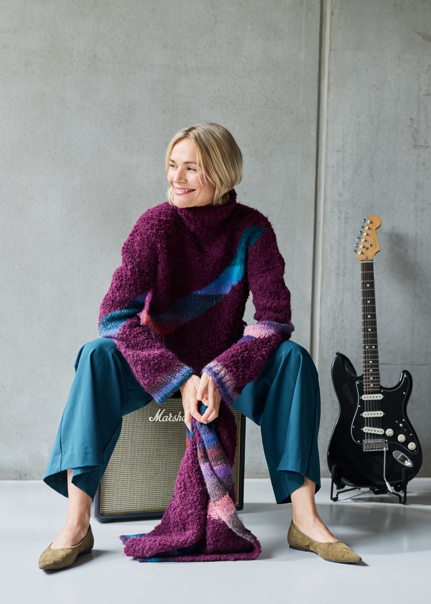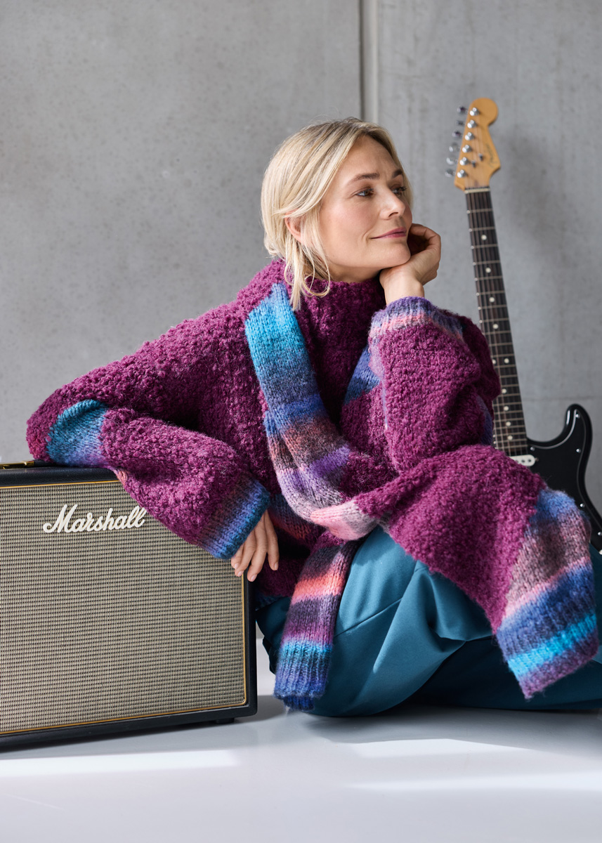 Lana Grossa-kvalitet „Orsetto” (60 % ren ny ull (merino), 40 % alpakka (superfine), løpelengde = ca. 75 m/50 g): ca. 300 (350 – 400) g burgunder (farge 5) og Lana Grossa-kvalitet „Bomba” (85 % ren ny ull (merino extrafine), 15 % polyamid, løpelengde = ca. 290 m/100 g): ca. 100 (200 – 200) g Brombeer/ cyklamen/grå/koralle/petrol/fiolett/tyrkis/bordeaux/syrenlilla/ royal/gammeltrosa (farge 3); pinner nr. 4 og 6, 1 rundpinne nr. 4, 40 cm lang.
