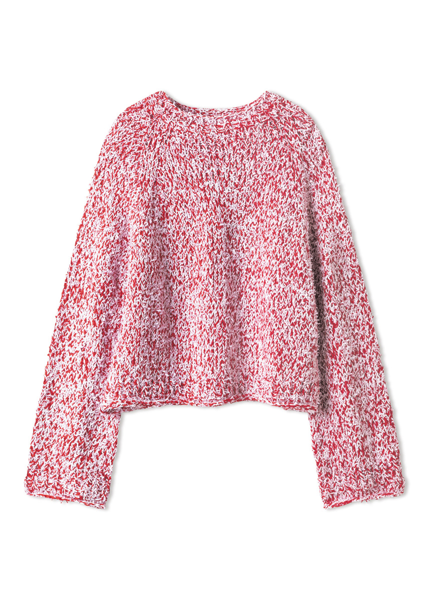 Lana Grossa-kvalitet ”Summer Softness” (80 % bomuld (økologisk), 20 % ren ny uld (merino superfine), løbelængde = ca. 130 m/50 g): ca. 300 (350 - 350 - 400) g rød (farve 7); Lana Grossa-kvalitet ”Frizzante” (54 % bomuld, 46 % polyamid, løbelængde = ca. 105 m/50 g): ca. 300 (300 - 350 - 350) g hvid (farve 16); kort og lang rundpind nr. 7 og nr. 9; maskemarkører (MM).
