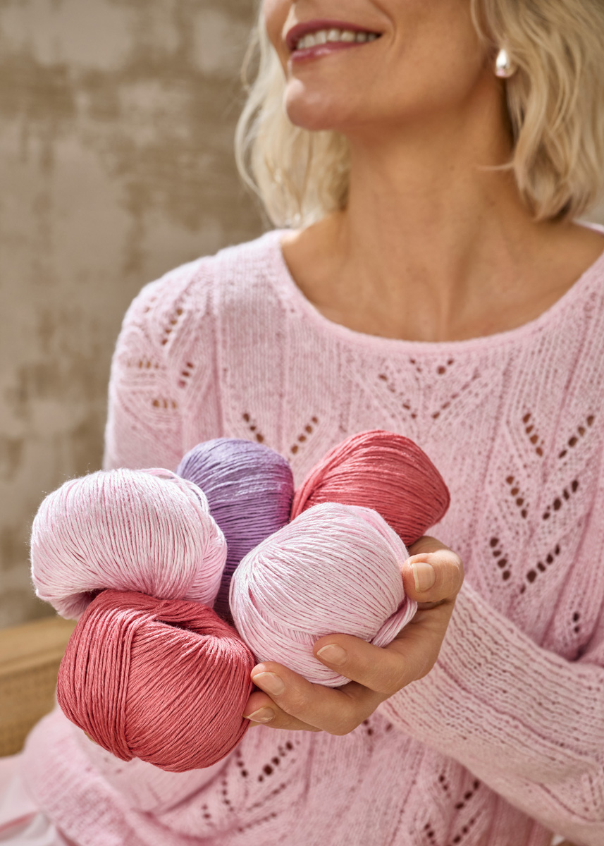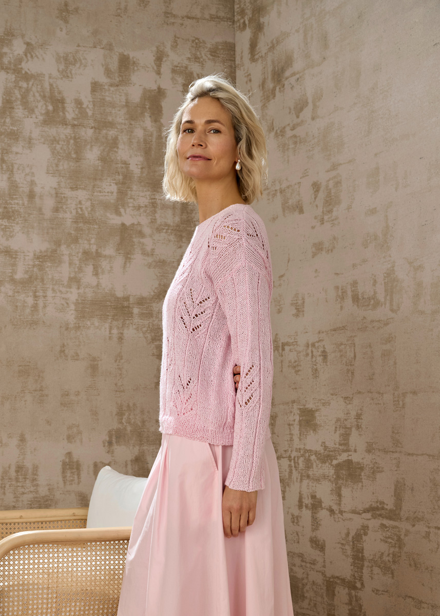 Lana Grossa-Kvalitet Tencellino (51% hør, 49% Tencel, løbelængde 125 m/50 g), 500 (550 – 600) g rosa (farve 13); strikkepinde nr. 3½ og 4 samt rundpind nr. 4, 40 cm lang.