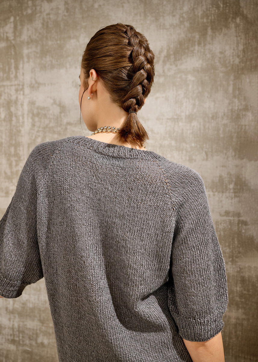 Lana Grossa-Kvalitet Tencellino (51% hør, 49% tencel, løbelængde 125 m/50 g), 350 (400 – 450) g antracit (farve 16); rundpinde nr. 3, 40 og 60 cm og rundpinde nr. 4, 40, 60 og 80 cm samt 4 maskemarkører.