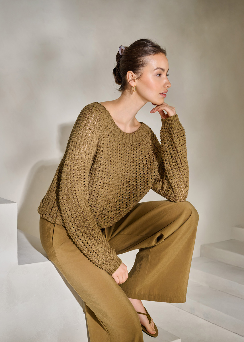 Lana Grossa-Kvalitet Tessera (100% bomuld, løbelængde 115 m/50 g), 550 (600 – 650) g grønbrun (farve 18); strikkepinde nr. 4½ og rundpind nr. 4, 40 cm.