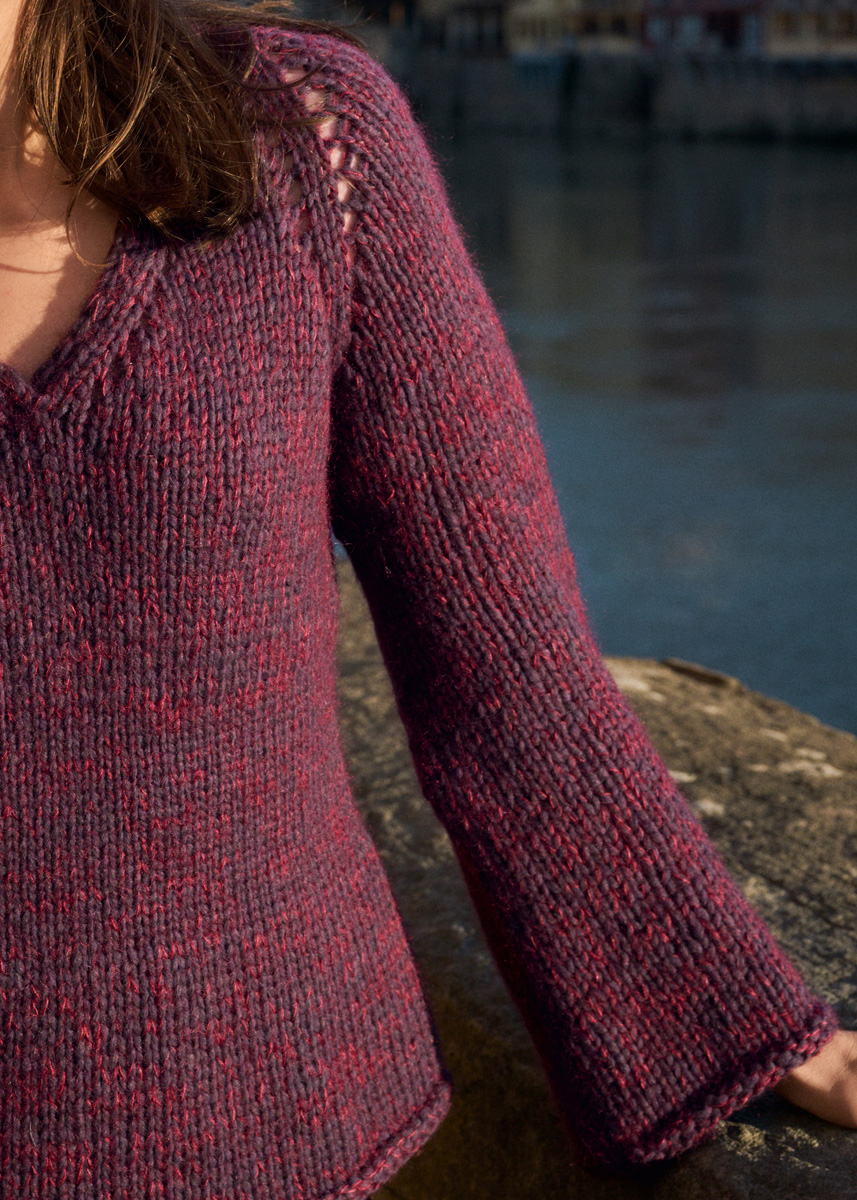 Lana Grossa-kvalitet ”Winter Softness” (62% ren ny uld (merino), 38% bomuld (bio), løbelængde = ca. 70 m / 50 gr.): ca. 400 (450 – 500 – 550) gr aubergine (fv 9), Lana Grossa-kvalitet ”Silkhair” (70% mohair (superkid), 30% silke, løbelængde = ca. 210 m / 25 gr.): ca. 75 (75 – 100 - 100) gr bordeaux (fv 113), en kort og en længere rundpind nr. 4, 6 og 8.