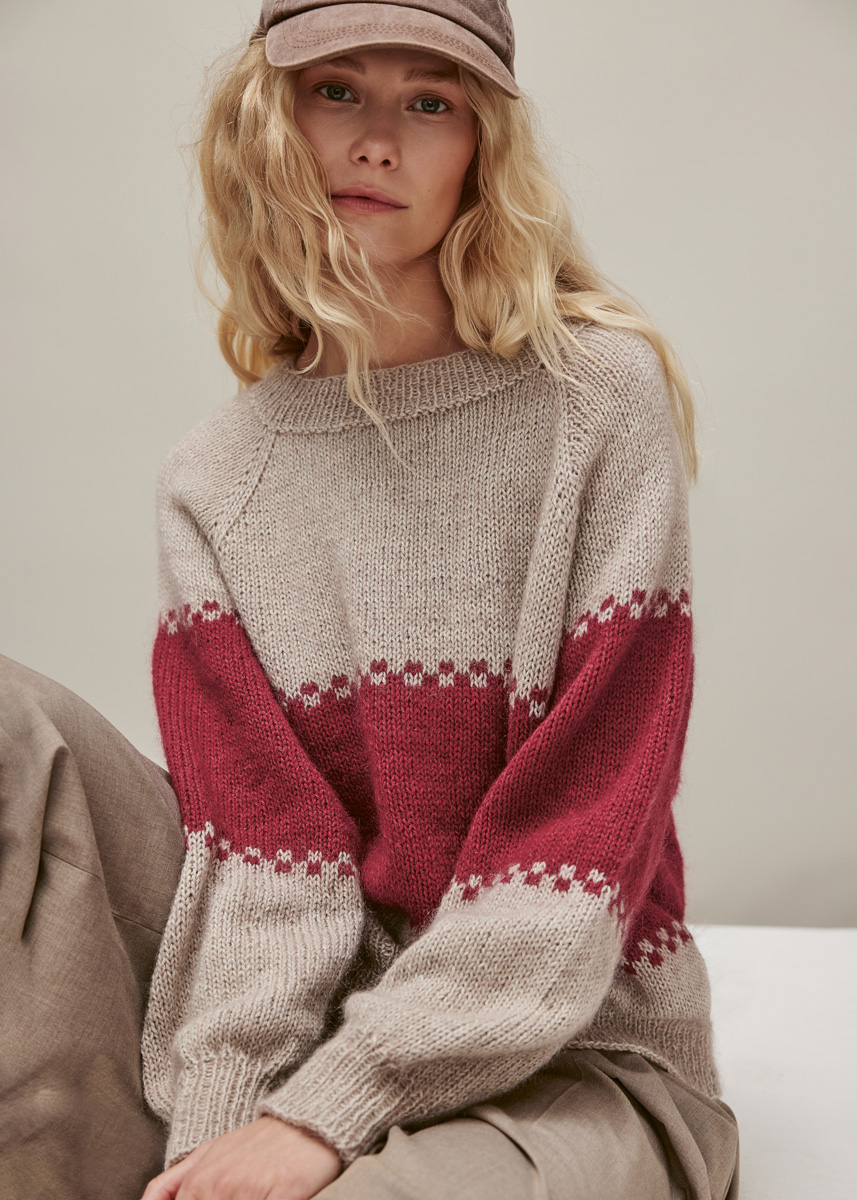 Lana Grossa Natural Lama Fine (100 % lama (baby), løbelængde = 150 m / 50 g): 200 (250 / 250 / 300) g gråbeige (fv 112) og 150 (150 / 200 / 200) g vinrød (fv 117) og Lana Grossa Silkhair (70 % mohair (superkid), 30 % silke, løbelængde = 210 m / 25 g): 50 (75 / 75 / 75) g bordeaux (fv 113) og 75 (75 / 100 / 100) g perlebeige (fv 123); rundpind nr. 4 og 5, 80 - 100 cm (Arb med mindre omkreds kant strikkes enten med Magic Loop-metoden eller på strømpepinde nr. 4 og 5); 5 maskemarkører, 1 af dem i en anden farve eller form til markering af omgangsskiftet (=MM0) TIP: for begyndere er det en god idé at bruge markører med numrene 0 til 4. Alternativt kan små etiketter med numre hænges på markørerne.