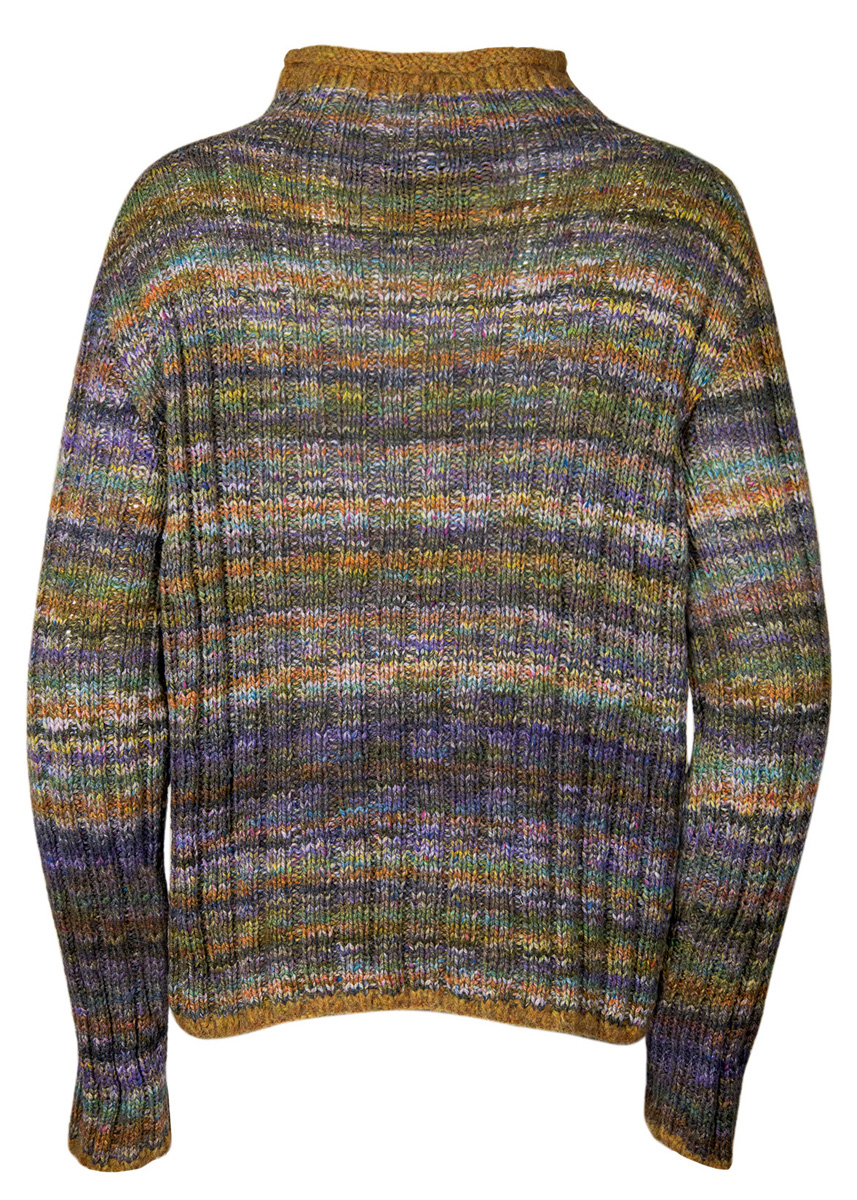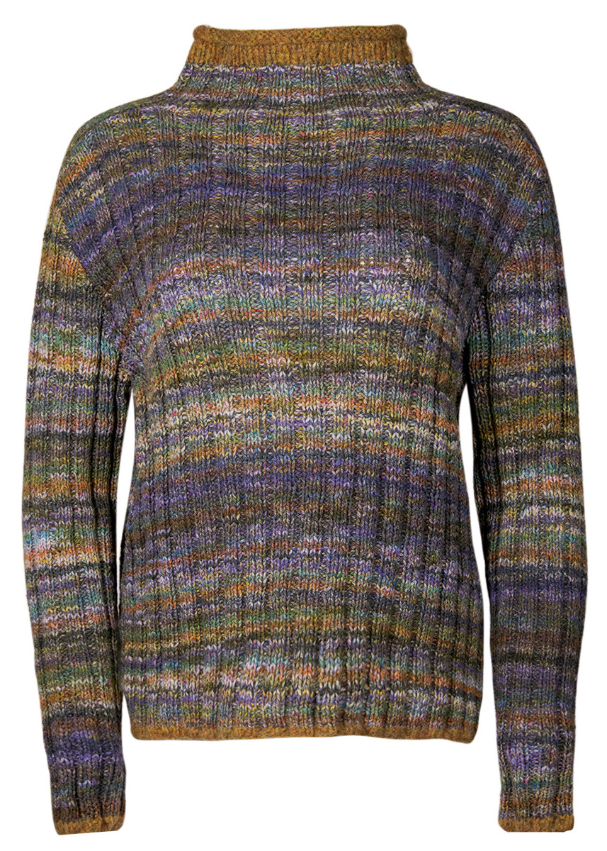 Lana Grossa-kvalitet ”Marisa” (80 % ren ny uld (merino), 20 % polyakryl, løbelængde = ca. 150 m / 50 gr.): 400(450) gr lilla/turkis/mosgrøn/okker/syren/oliven (fv 6) og Lana Grossa-kvalitet ”Nuvoletta” (42 % (baby) alpaka, 42 % ren ny uld (ekstrafin merino), 16 % polyamid. Løbelængde = ca. 250 m / 50 gr): ca. 50 gr sennep (fv 11), strikkepinde nr. 4, rundpind nr. 4, 50 cm