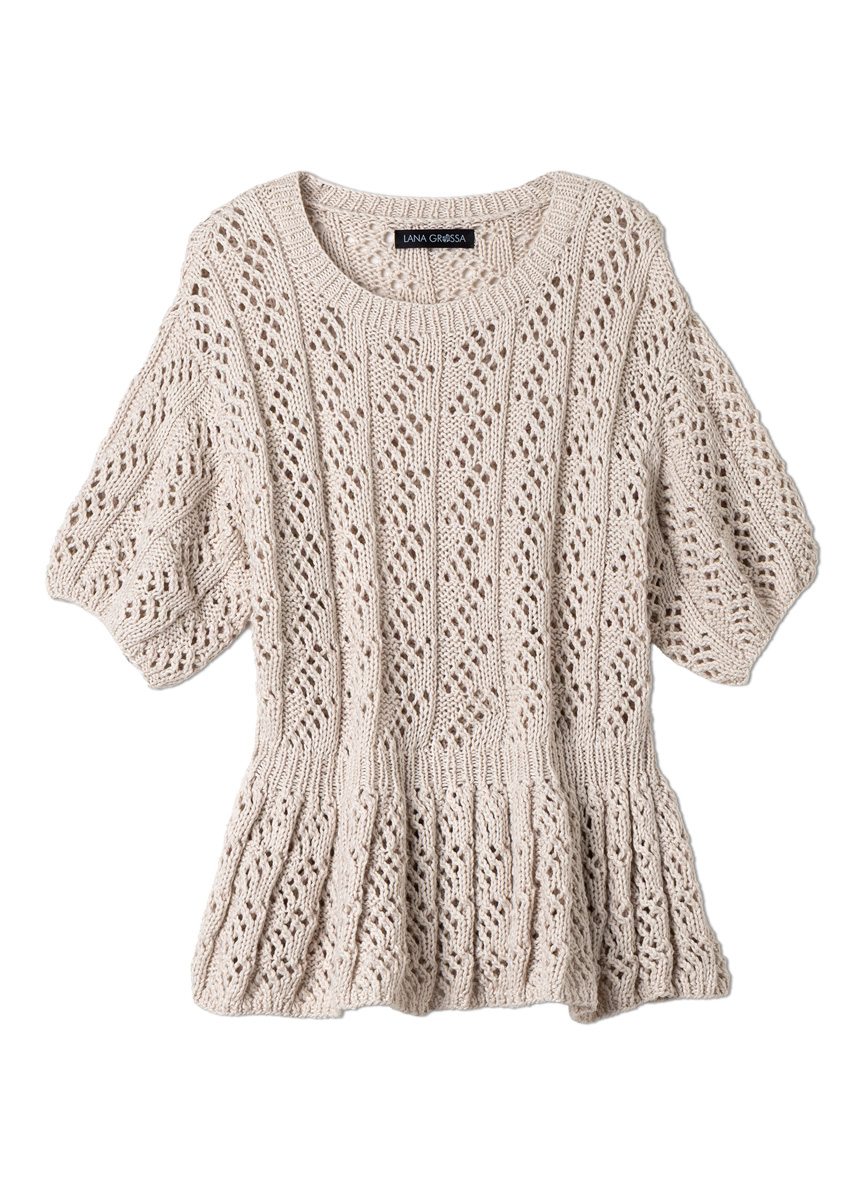 Lana Grossa Cotonella (100% (pima) bomull, løpelengde = ca. 280 m/100 g), 400 (400 – 500) g pastellbeige (farge 202). strikkepinner nr. 3 og nr. 5 og én 40 cm lange rundpinne nr. 3.