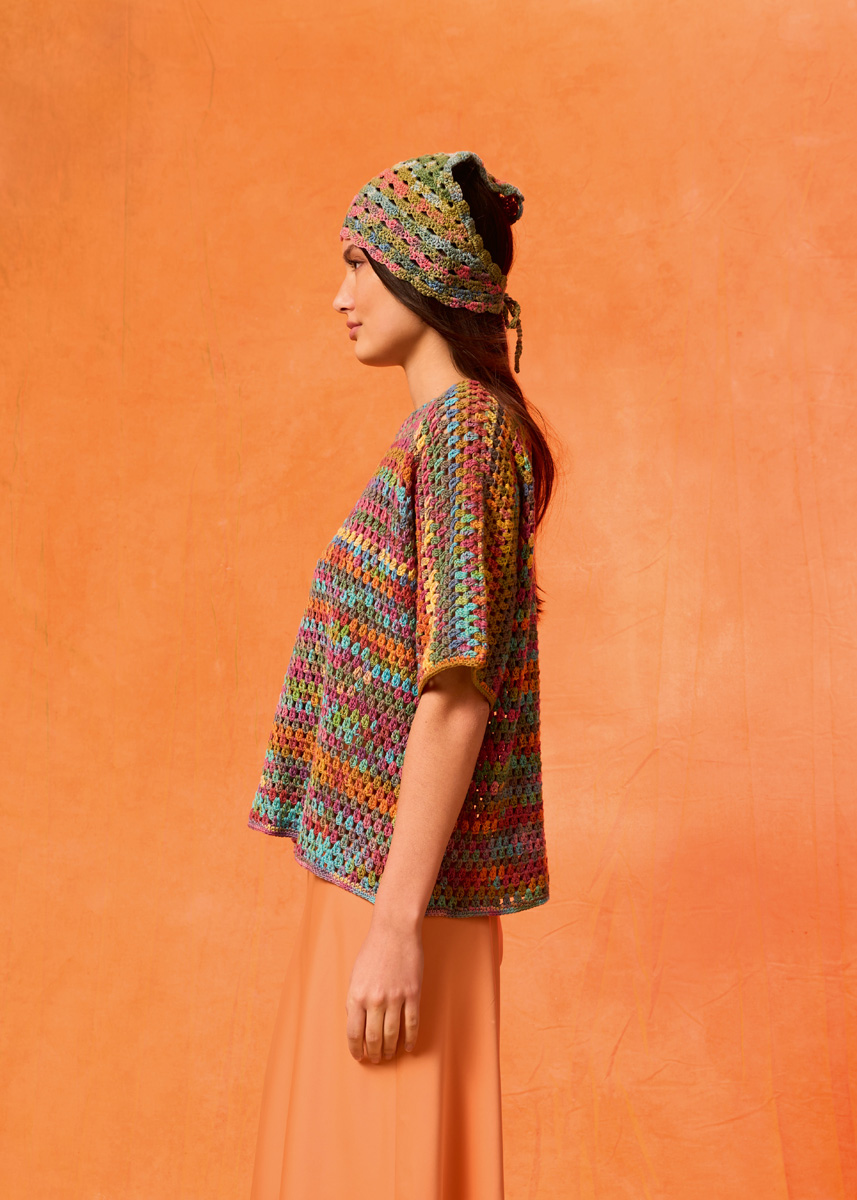 Lana Grossa-kvalitet „Gomitolo Alga“ (65 % bomull, 23 % viskose (bambus), 12 % seacell, løpelengde = ca 280 m/100 g): ca 4 (5 - 5 - 6) nøster = ca 400 (500 - 500 - 600) g grågrønn/tyrkis/fuchsia/gul/vårgrønn/oransje/olivenen/Himmelblå/blå/gammelrosa/hvit (farge 2027); heklenål nr. 3,5.