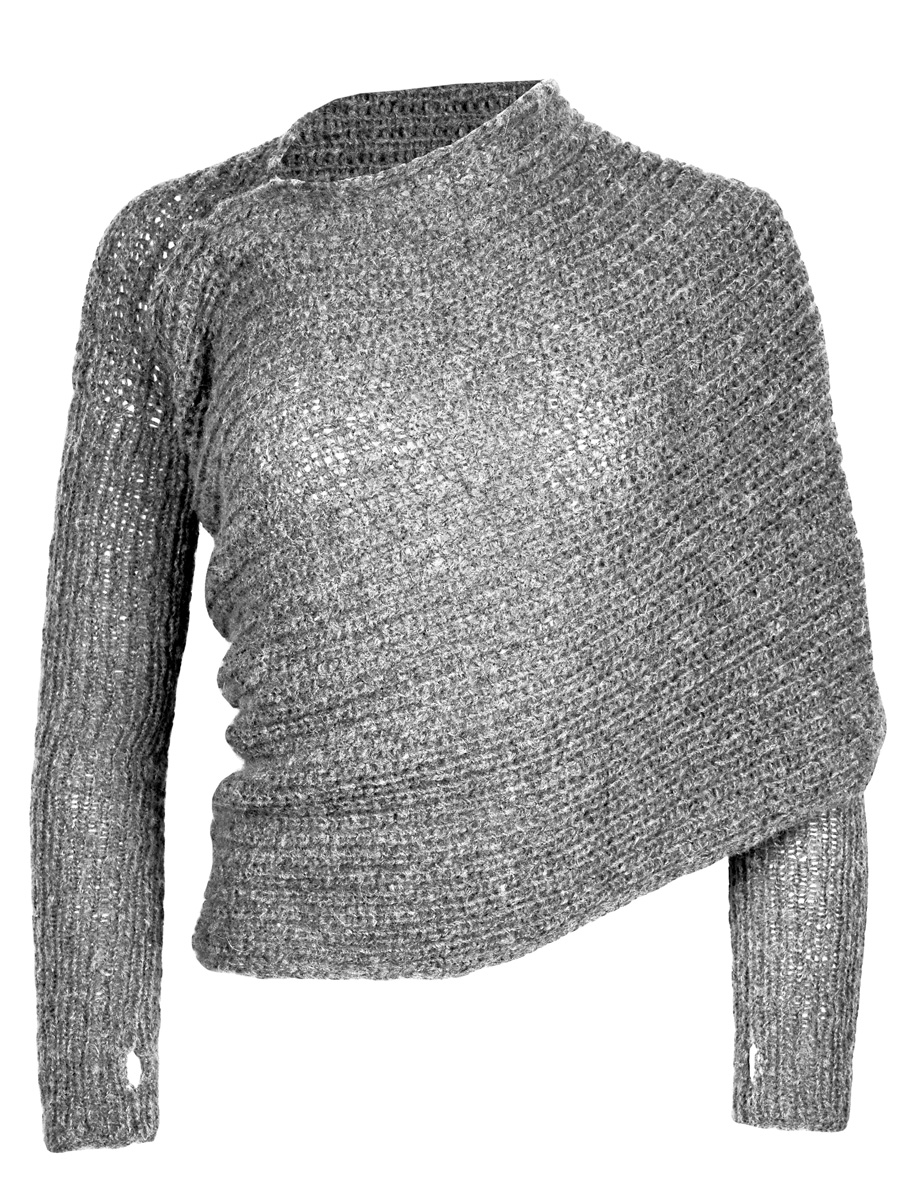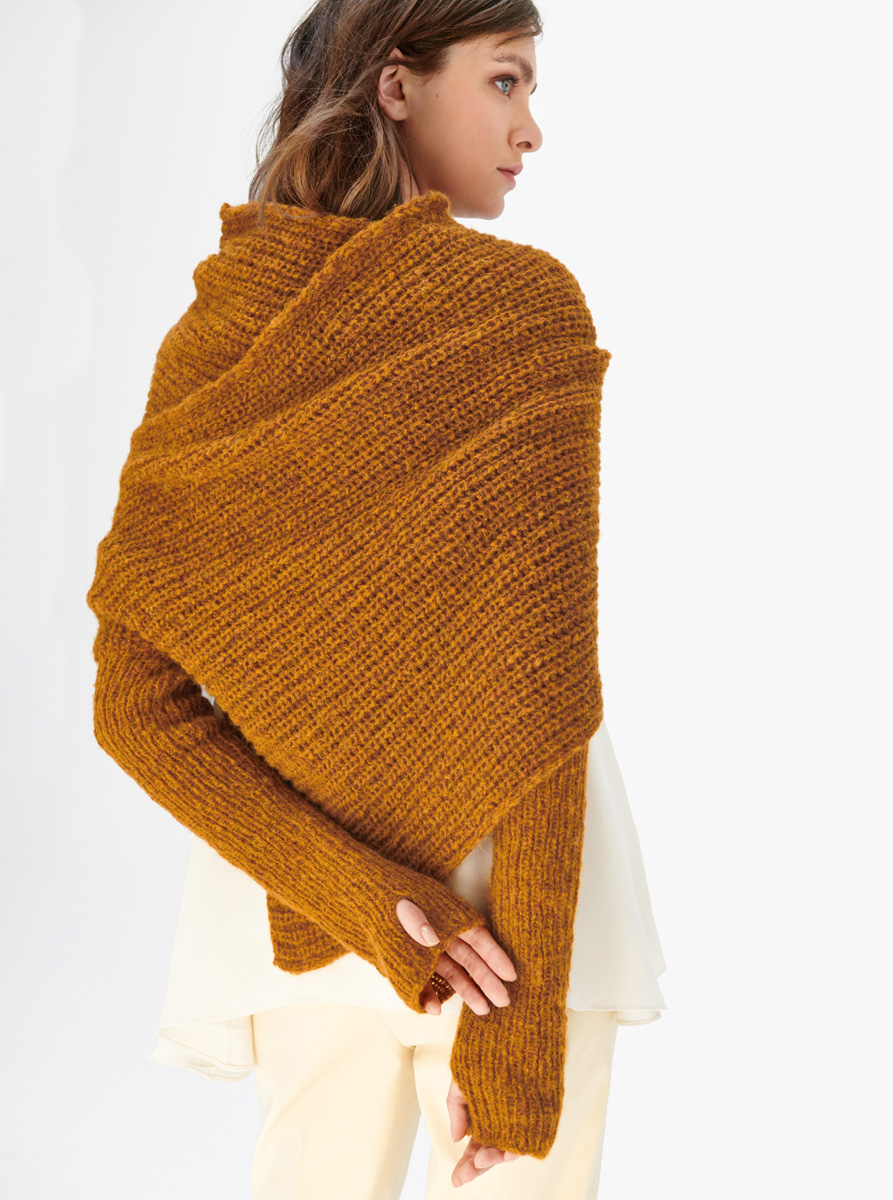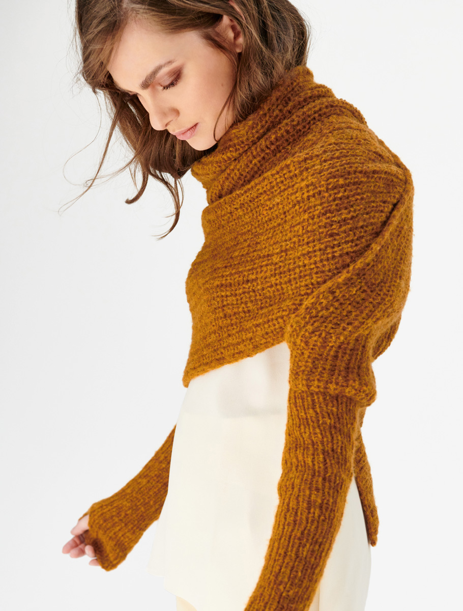 Lana Grossa Cool Air Fine (50% jomfru ull merino, 28% baby alpakka, 22% polyamid, løpelengde 240 m/50 g), 250 (300) g oransjebrun (farge 9); 1 rundpinne nr. 6, 80 cm lang og settepinner nr. 5