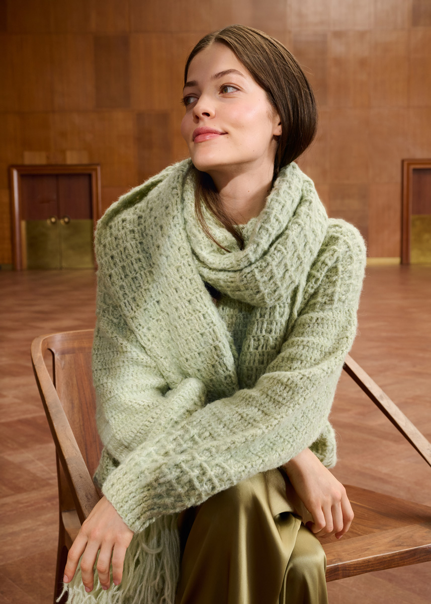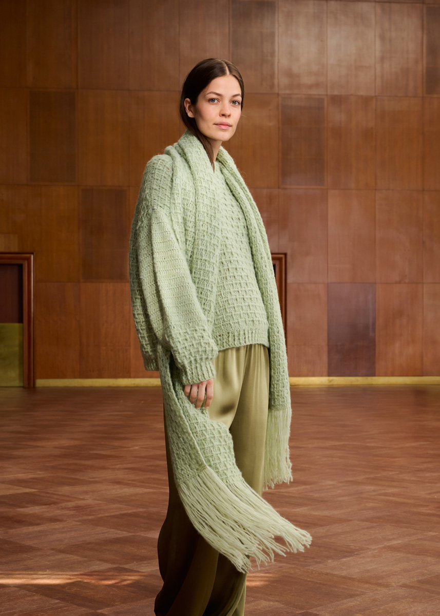 Lana Grossa Airy (42% alpakka (baby), 40% bomull, 18% ren ny ull (ekstrafin merino), løpelengde 170 m/50 g), 300 g hvitgrønn (farge 19); 1 heklenål nr. 4,5.