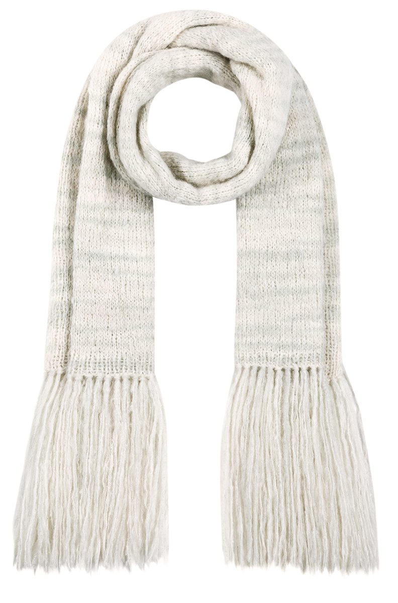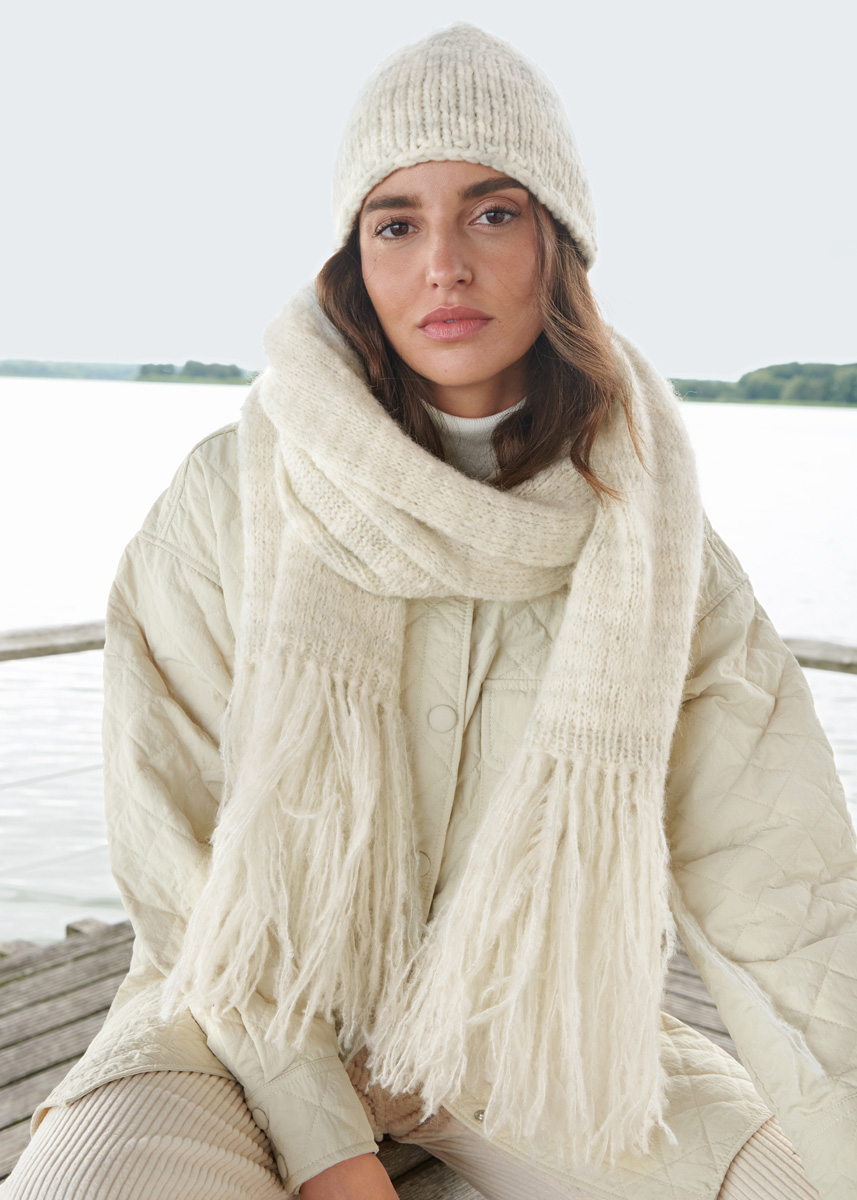 Lana Grossa Inizio Pelo (40% (baby) alpacka, 30% ren ny ull (merino), 15% polyamid, 9% modal, 6% bomull, löplängd 185 m/50 g), 200 g råvit/silvergrå (färg 2); 1 rundsticka nr. 5, 60 cm lång, 1 virknål nr. 4 till fransarna.