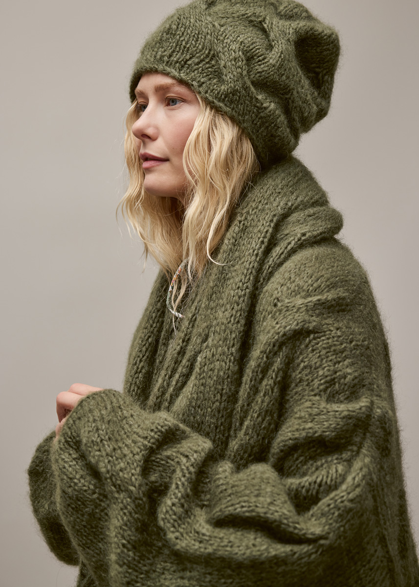 Lana Grossa Mohair di Gio (55 % mohair (superkid), 45 % uld (merino superfin), løbelængde = 85 m/50 g): 350 g bregnegrøn (fv 14); rundpinde nr. 6 og 7, 1 snoningspind.