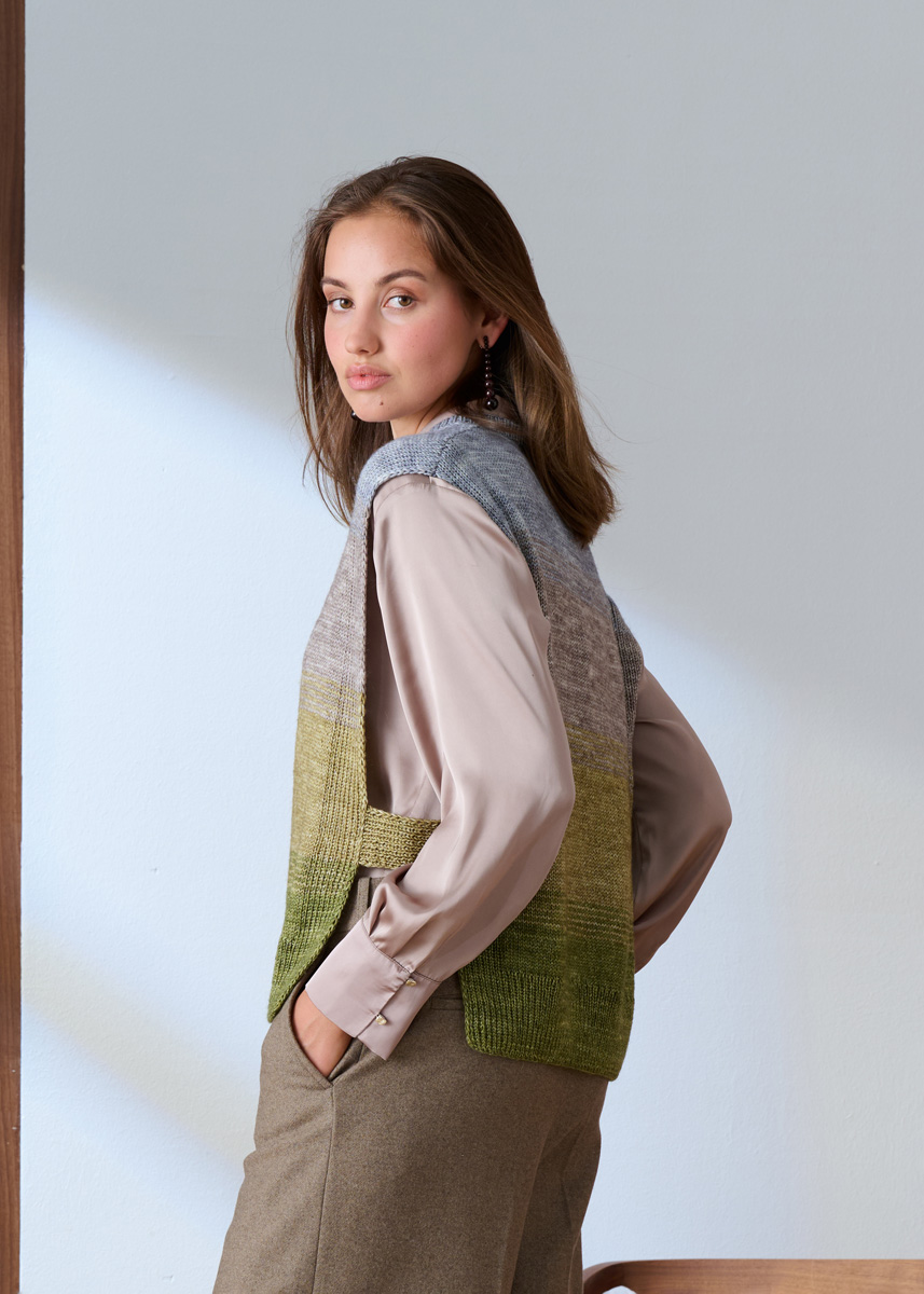 Lana Grossa Brigitte Silkdream (60% ren ny ull (fin merino), 30% silke, 10% mohair (superkid), løpelengde 270 m/50 g), 50 (100 – 100) g oliven (farge 7), 50 (100 – 100) g khaki (farge 6), 50 (100 – 100) g gråbeige (farge 4) og 50 (100 – 100) g grå (farge 15); 1 rundpinne nr. 4, 60 cm lang og 1 rundpinne nr. 3,5, 40 cm lang.