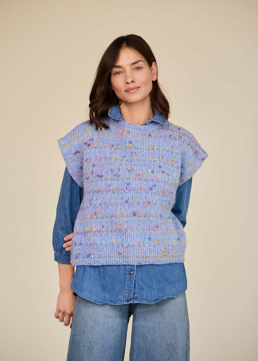 Lana Grossa „Cassata“ garn (54% jomfruuld (ekstrafin merinould), 30% polyamid, 16% bomuld, LL = ca. 175 m/50 g): ca. 150 (200 - 200 - 250) g i lyseblå/rosa/gul/ orange/blålilla (fv 5); strikkepinde 4,5 og 5 mm; 1 kort rundpind 4,5 mm.