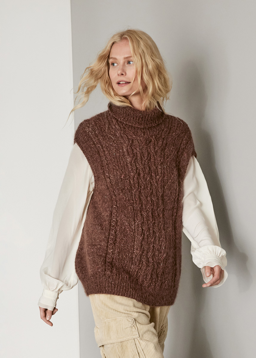Lana Grossa Ecopuno (72 % bomuld, 17 % ren ny uld (merino), 11 % alpaka (baby), løbelængde = 215 m/50 g): 200 (250 / 250 / 300) g chokoladebrun (fv 224) og Lana Grossa Natural Superkid Tweed (60 % mohair (superkid), 30 % silke, 7 % bomuld, 3 % polyester; løbelængde = 200 m/25 g): 100 (125 / 125 / 150) g nougat (fv 637); rundpind nr. 3 og nr. 5, 80-100 cm (omgange med mindre omkreds strikkes med Magic-Loop-metoden eller en ekstra kort rundpind nr. 5); snoningspind.