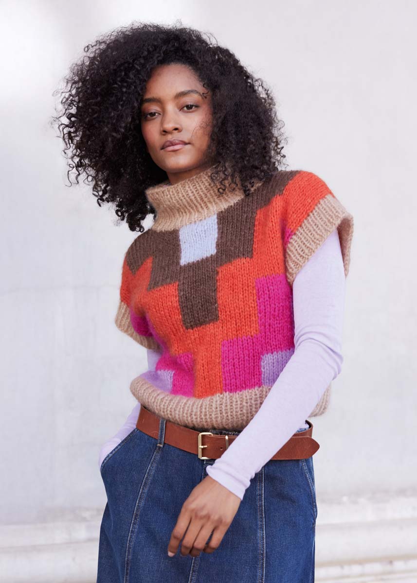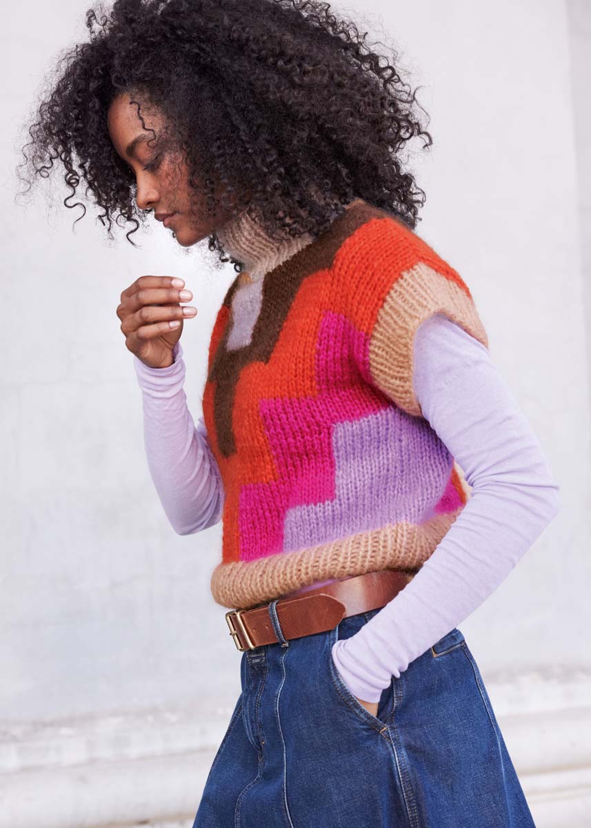 Lana Grossa Mohair di Gio (55% mohair (superkid), 45% ren ny ull (merino superfin), løpelengde = ca. 85 m/50 g), 100 (150 - 150) g i oransjerød (farge 6), 100 g i pink (farge 3), 100 g i gråbrun (farge 7), 100 g i syrinlilla (farge 1) og 100 g i beige (farge 8) og 50 g i pastellblå (farge 10); strikkepinne nr. 6 og nr. 7; en 60 cm lang rundpinne nr. 6.