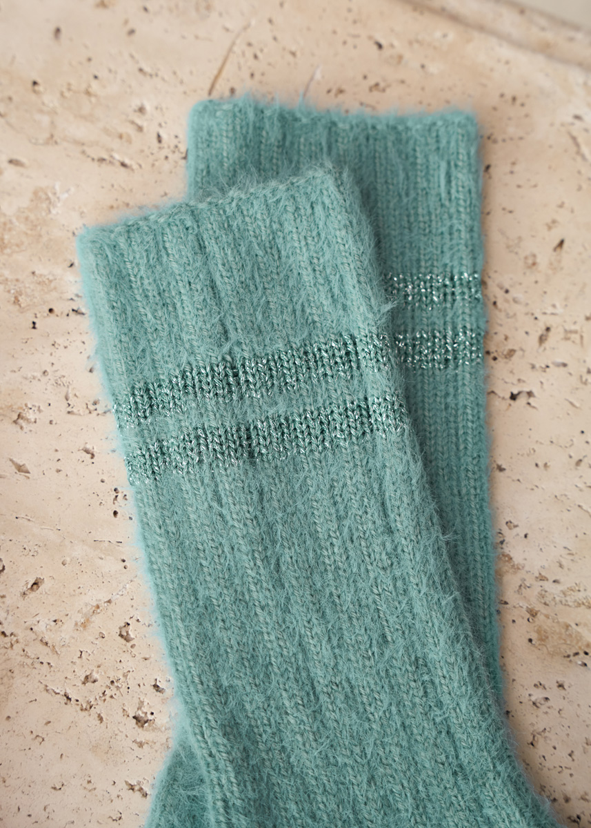 Variant A: Lana Grossa-Qualitet Cosy Socks (70% ren ny uld (merino), 30% polyamid, løbelængde ca. 400 m/100 g): 100 g lyseblå (farve 4) og Brillino (83% viskose, 17% metallisk fiber, løbelængde ca. 200 m/25 g): 25 g lyseblå/sølv (farve 22); Variant B: Lana Grossa-Qualitet Cosy Socks (70% ren ny uld (merino), 30% polyamid, løbelængde ca. 400 m/100 g): 100 g rosa (farve 1) og Brillino (83% viskose, 17% metallisk fiber, løbelængde ca. 200 m/25 g): 25 g hvid/rosa (farve 8); Variant C: Lana Grossa-Qualitet Cosy Socks (70% ren ny uld (merino), 30% polyamid, løbelængde ca. 400 m/100 g): 100 g salviegrøn (farve 6) og Brillino (83% viskose, 17% metallisk fiber, løbelængde ca. 200 m/25 g): 25 g turkis/sølv (farve 36). Til alle varianter: Et sæt strømpepinde nr. 2½
