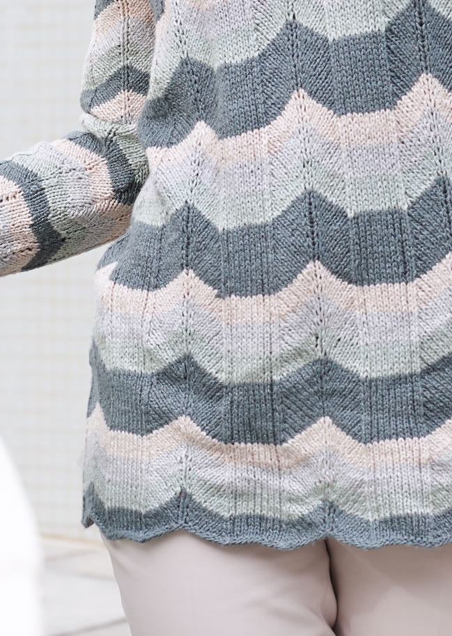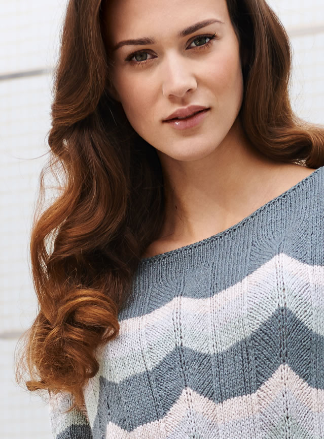 Lana Grossa-kvalitet ”Linarte” (40 % viskose, 30 % bomuld, 20 % hør, 10 % polyamid, løbelængde = ca. 125 m / 50 gr.): ca. 300(350) gr. skiffer (fv. 64), ca. 150(200) gr. grågrøn (fv. 61), sølvgrå (fv. 60) og beige (fv. 62), strikkepinde nr. 4, en kort rundpind nr. 3½