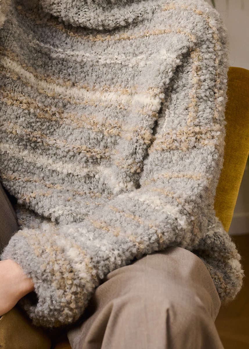 Lana Grossa-kvalitet “Orsetto” (60% ren ny uld (merino), 40% alpaca (superfin), løbelængde = ca. 75 m / 50 gr): 400 (450 - 500 - 550) gr lysegrå (fv 14), 100 (150 – 150 – 150) gr beige (fv 6) og 100 (100 – 100 – 150) gr råhvid (fv 16), strikkepinde nr. 6, en kort rundpind nr. 6.