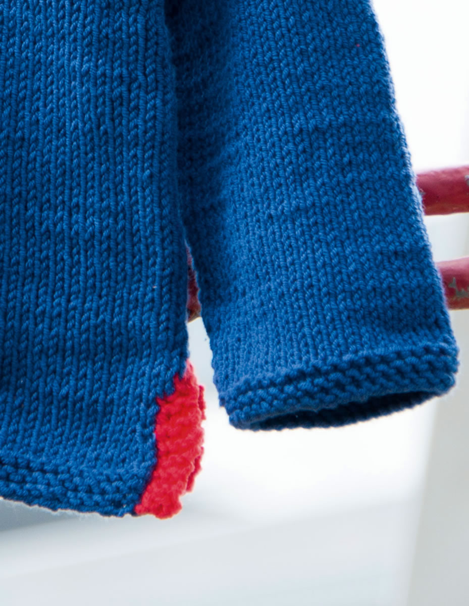 Lana Grossa-kvalitet »Elastico« (96 % bomuld, 4 % polyester, løbelængde = ca. 160 m / 50 gr.): 150 gr. royal (fv. 114), 50 gr. klar rød (fv. 78) og en rest hvid (fv. 1), strikkepinde nr. 3½, rundpind nr. 3½, 40 cm, hæklenål nr. 3, 2 knapper.