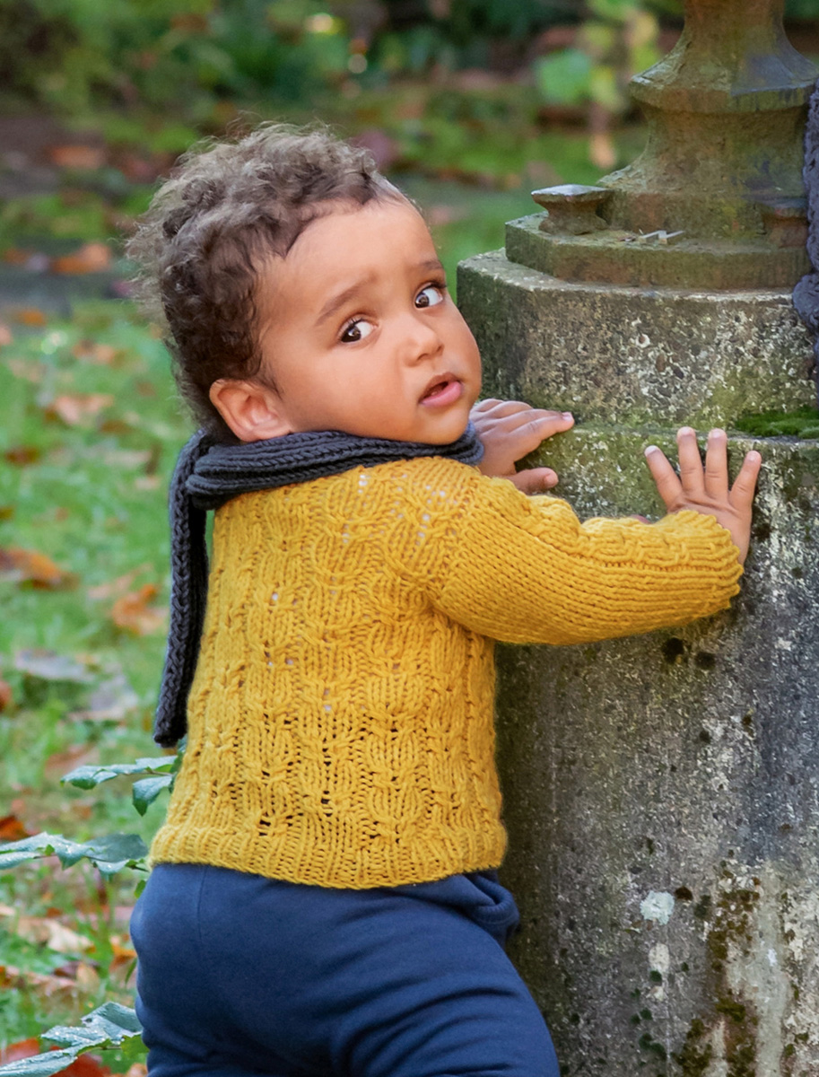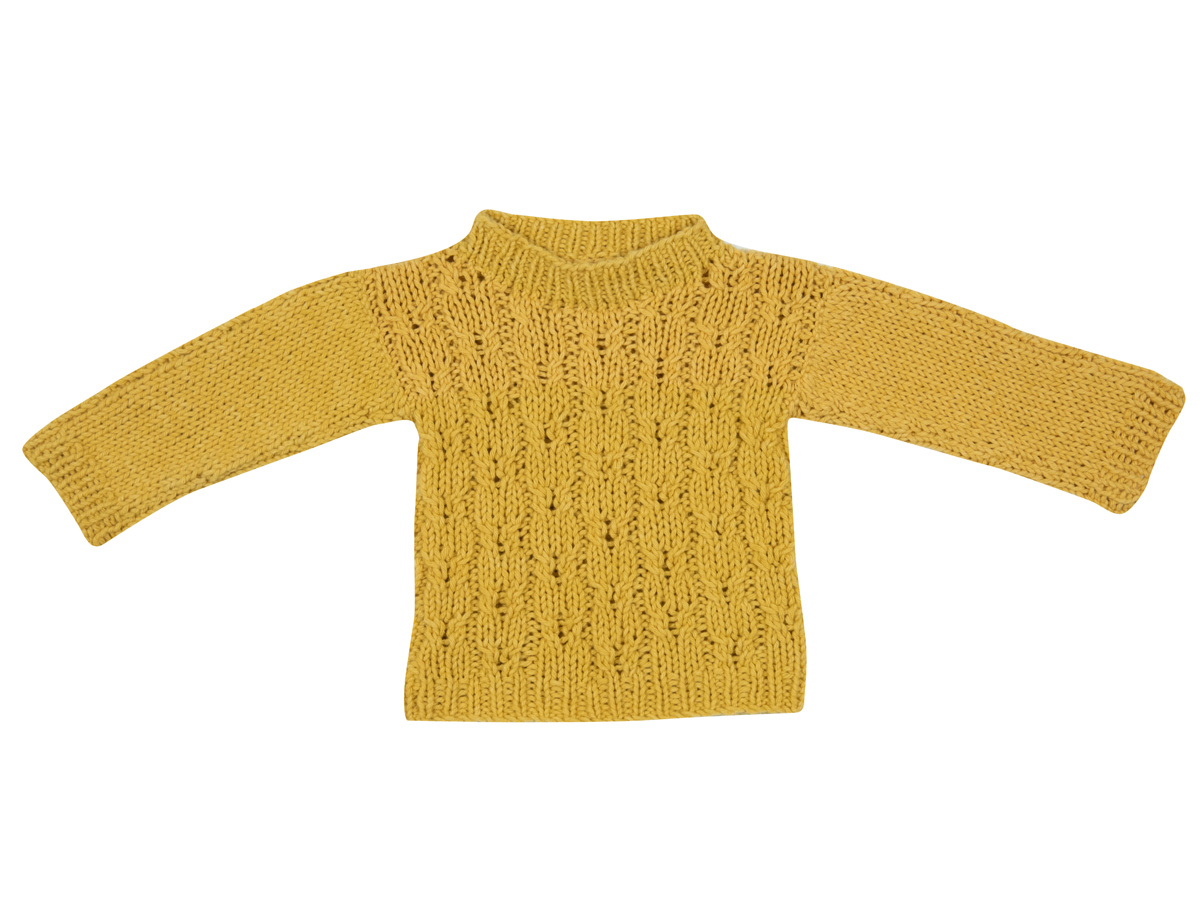 Lana Grossa-kvalitet ”Fourseason” (45 % ren ny uld (ekstrafin merino), 40 % (bio) bomuld, 15 % (rec.) cashmere, løbelængde = ca. 105 m / 50 gr.): ca. 100(150- 150) gr gul (fv 8), strikkepinde nr. 4½, rundpind nr. 4½, 40 cm.