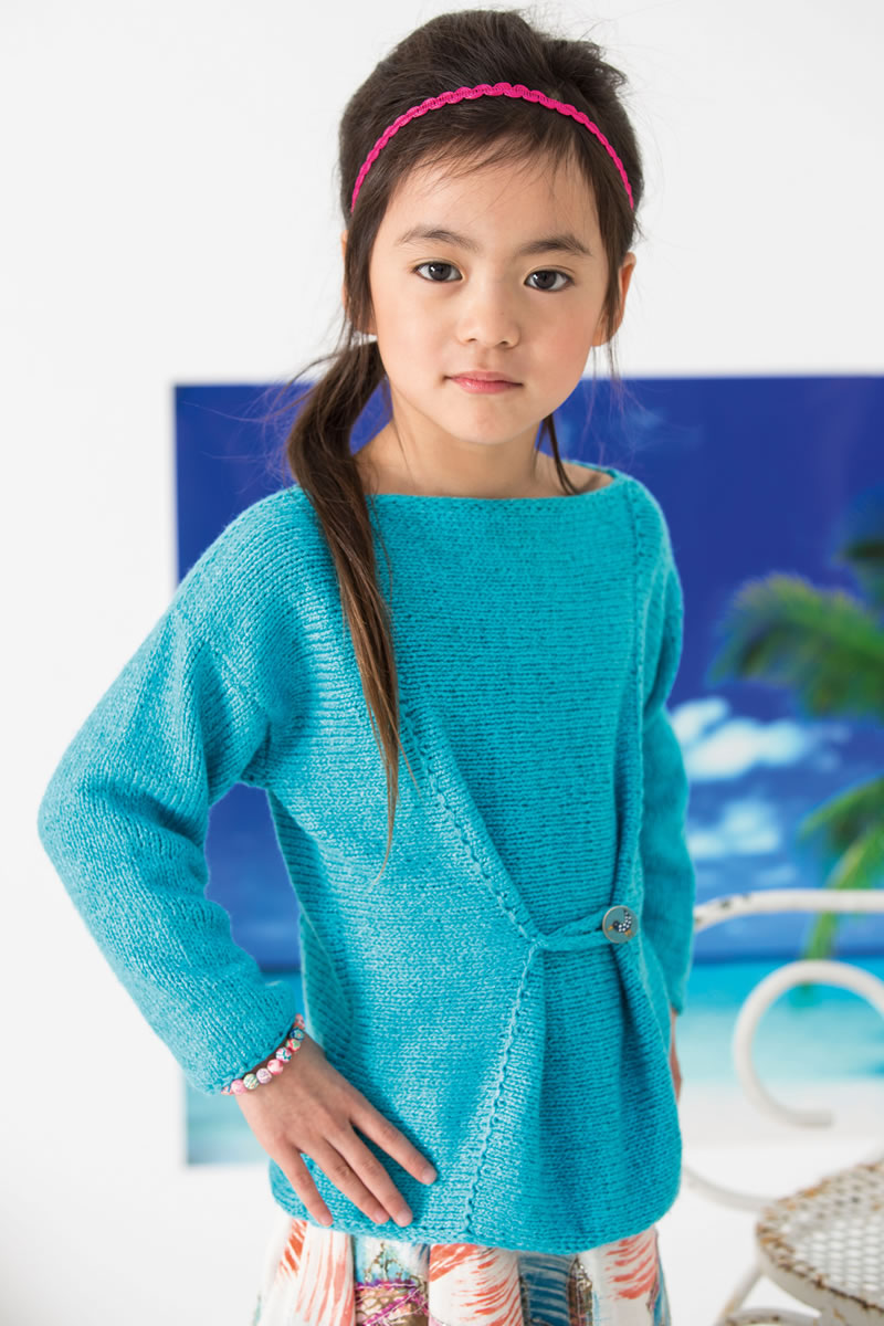 Lana Grossa-kvalitet „Linarte“ (40 % viskose, 30 % bomuld, 20 % hør, 10 % polyamid, løbelængde = ca. 125 m / 50 gr.): ca. 300(350) gr. turkis (fv. 39), strikkepinde nr. 4, 2 strømpepinde nr. 4, 1 knap fra Union Knopf, art. 12290, fv. 2.