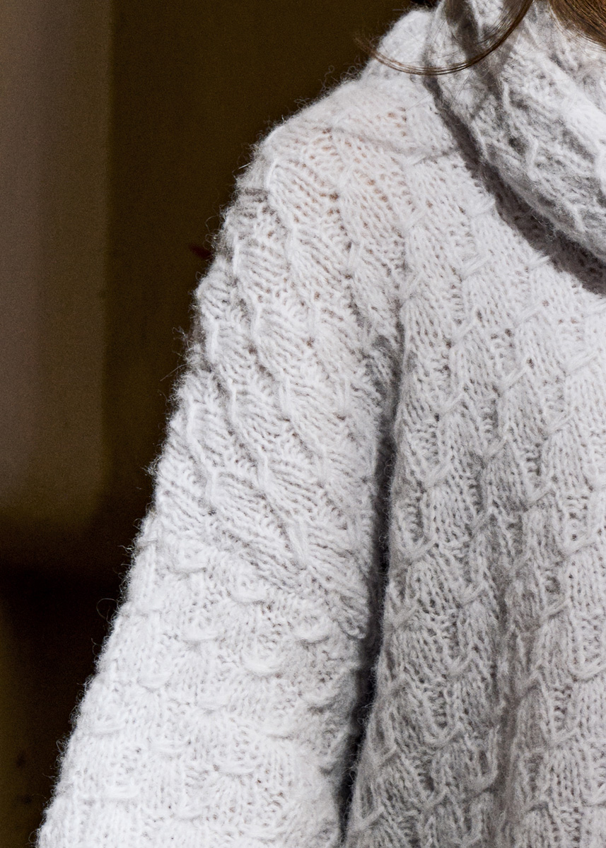 Lana Grossa-kvalitet ”Nebbia” (55% ren ny uld (ekstrafin merino), 45% alpaka (baby), løbelængde = ca. 170 m / 50 gr.): ca. 350 (350 – 400 - 400) gr hvidgrå (fv 8), strikkepinde nr. 5 og 5½, en kort rundpind nr. 5.