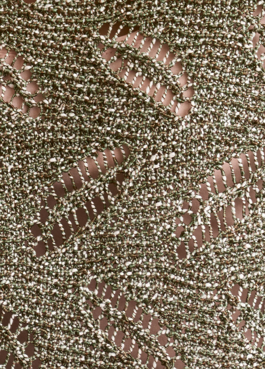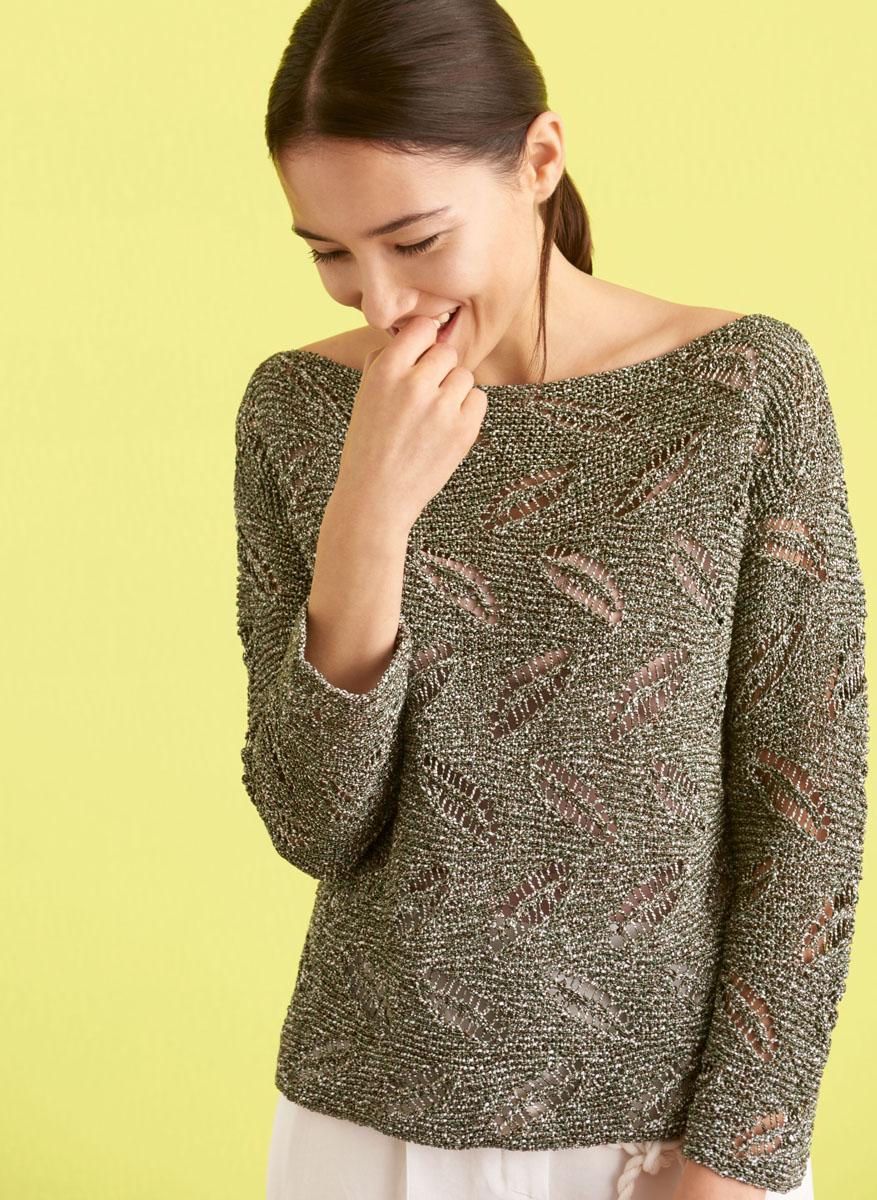 Lana Grossa-kvalitet ”Ombra” (75 % bomuld, 25 % polyester, løbelængde = ca. 120 m / 50 gr.): 450(500-550) gr grågrøn/natur (fv 5), strikkepinde nr. 3½ og 4.