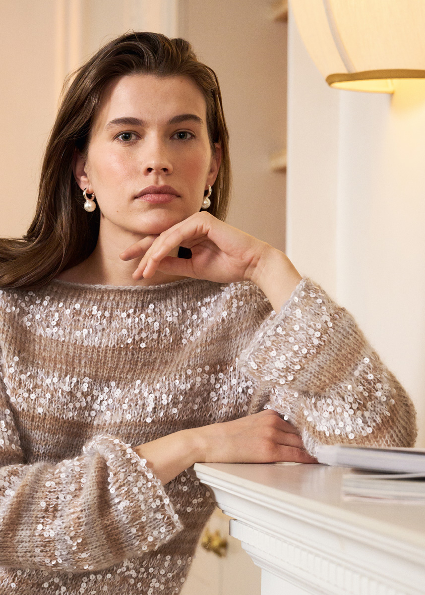 Lana Grossa-kvalitet “Superkid Seta” (65% mohair (superkid), 35% silke, løbelængde = ca. 100 m / 25 gr): 150 (175 – 200 – 225) gr creme/beige/sølvgrå (fv 101) og Lana Grossa-kvalitet “Cosmo” (710% bomuld (+ pailletter), løbelængde = ca. 260 m / 100 gr): 200 (200 – 200 – 200) gr hvid (fv 1), en kort og en lang rundpind nr. 4½ og 5½, maskemarkører.