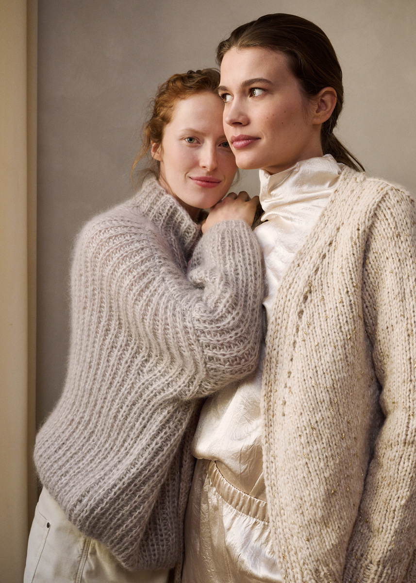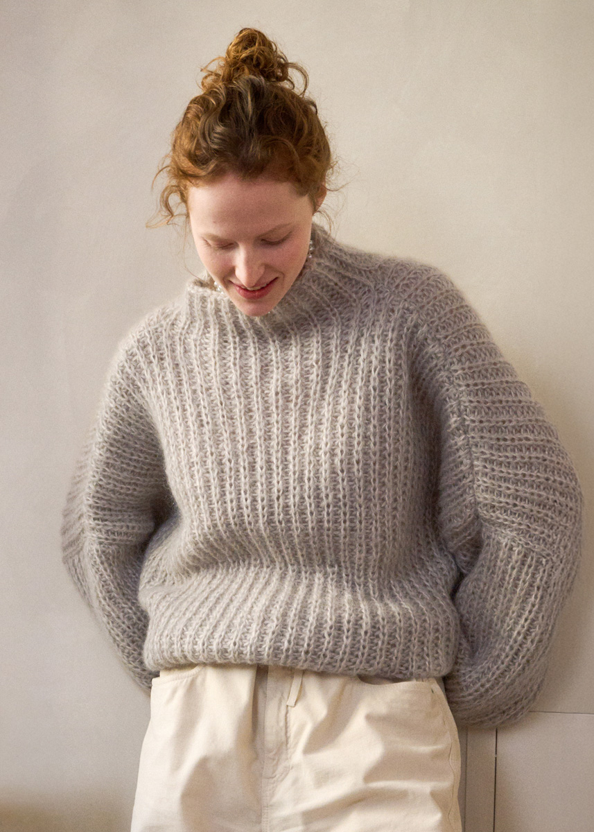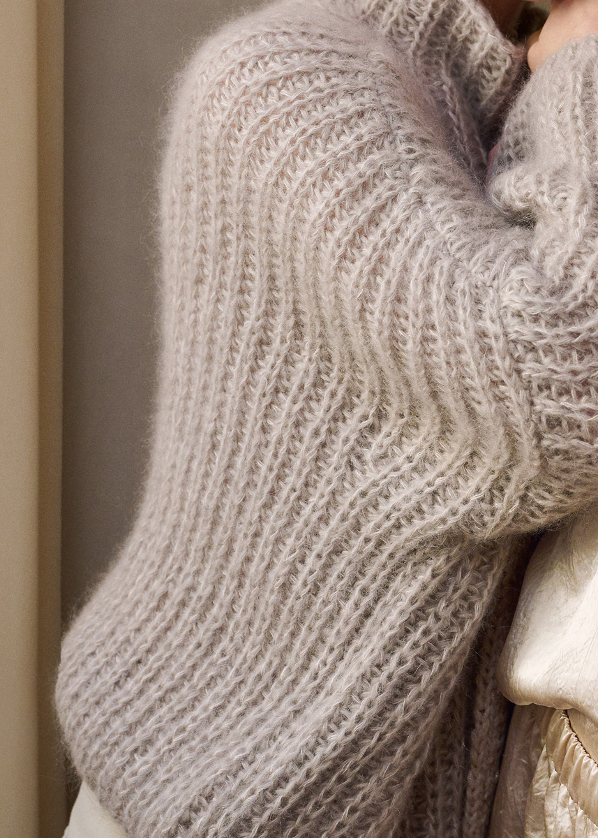 Lana Grossa-kvalitet “Superkid Seta” (65% mohair (superkid), 35% silke, løbelængde = ca. 100 m / 25 gr): 200 (225 – 225 – 250) gr gråbeige (fv 18) og Lana Grossa-kvalitet “Silkhair” (70% mohair (superkid), 30% silke, løbelængde = ca. 140 m / 50 gr): 225 (225 – 250 – 250) gr lys beige (fv 18), strikkepinde nr. 7 og 8, en kort rundpind nr. 7.