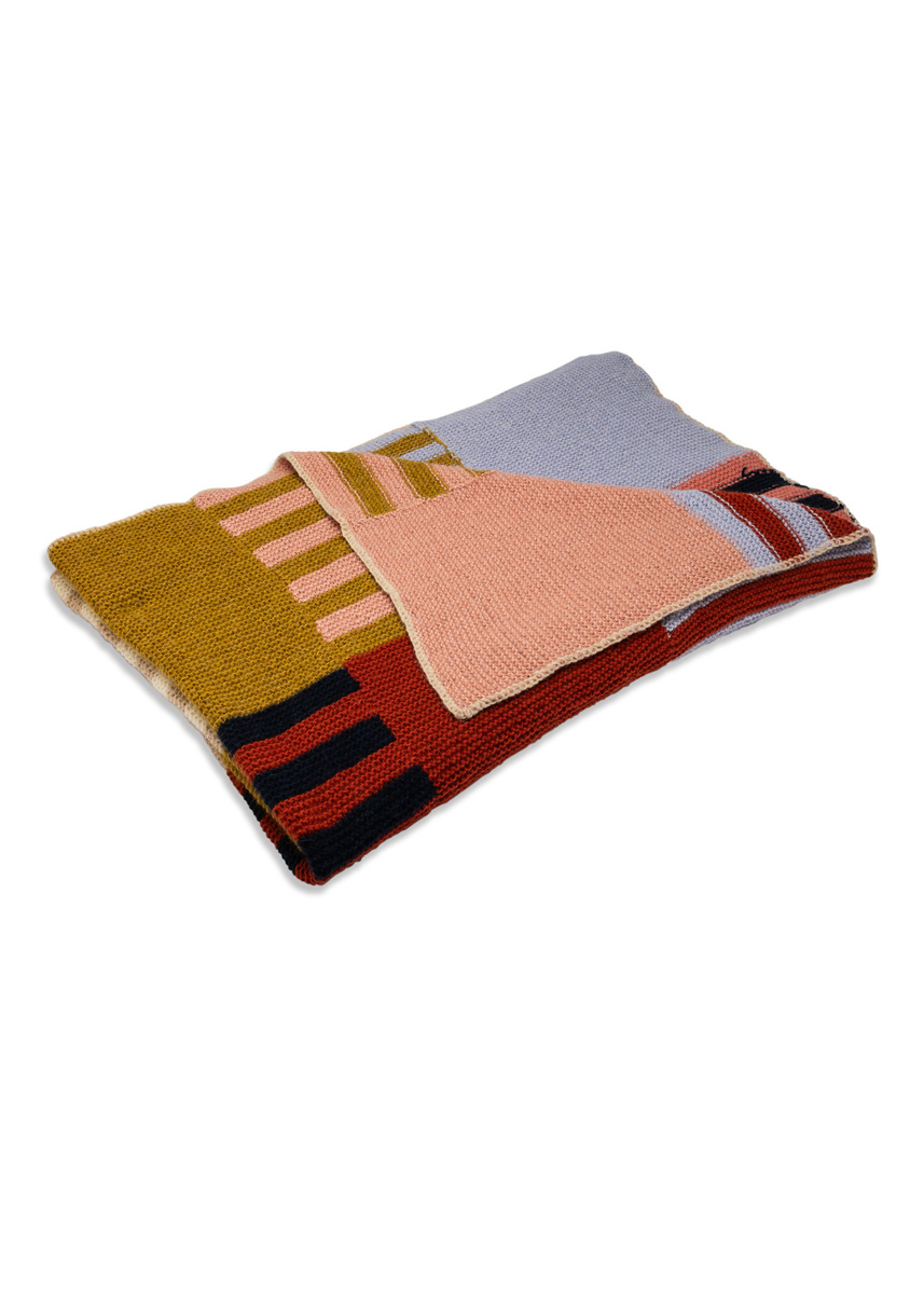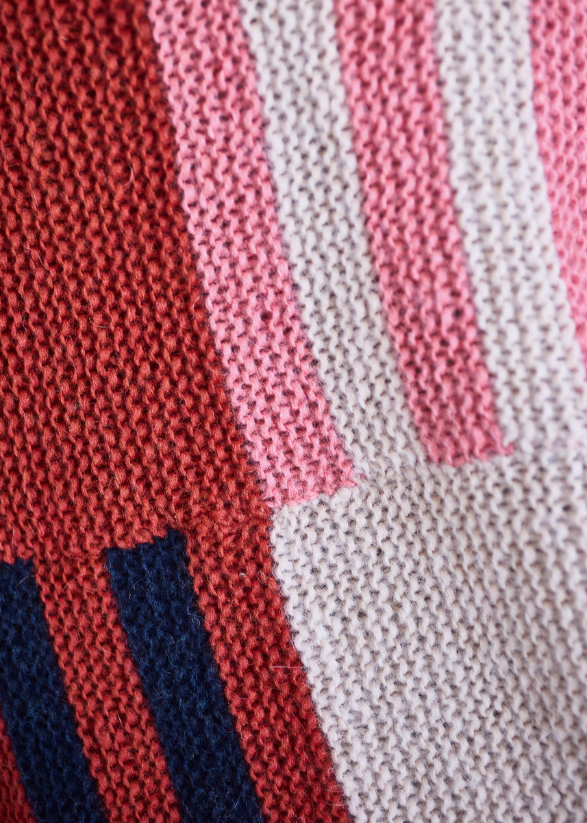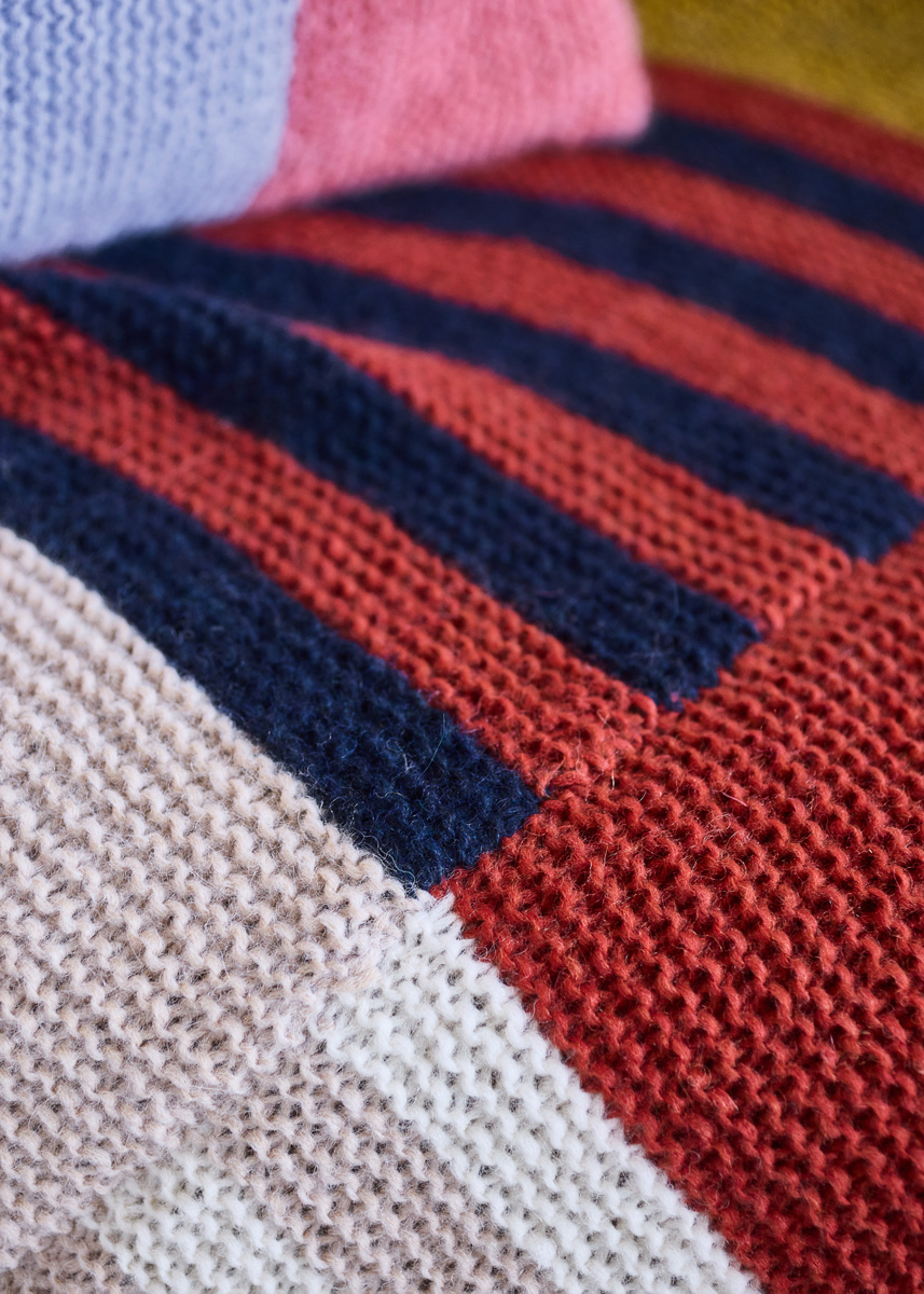 Lana Grossa-kvalitet „Brigitte No. 2” (47 % (baby) alpakka, 45 % bomull, 8 % ren ny ull (merino), løpelengde = ca. 140 m/50 g): ca. 250 g hver i nattblå (farge 5) og lysbeige (farge 47), je ca. 200 g råhvit (farge 16), sennepgul (farge 67), rust (farge 59) og sartlilla (farge 78) og je ca. 150 g laks (farge 46) og fersken (farge 55); 1 rundpinne nr. 6, 120 cm lang, 1 heklenål nr. 5.