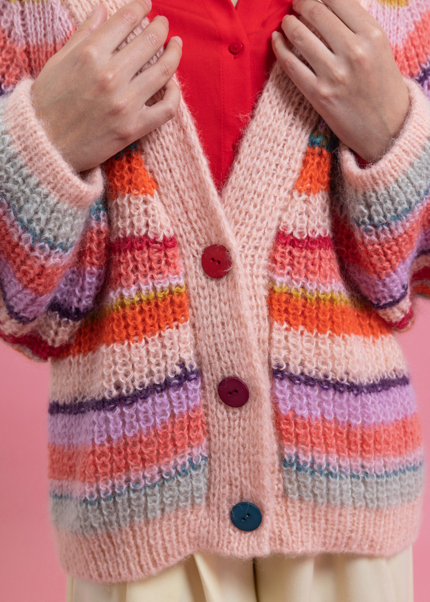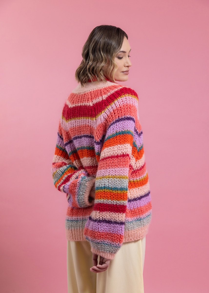 Cardiganen strikkes med dobbelt garn og sømløst i ét stykke, ovenfra og ned. Stolpen strikkes separat med tredobbelt garn og sys på til sidst. Modellen har en samlet længde på 60 (62 - 64 - 66 - 68 - 70) cm og har en brystvidde som er 26 cm større end en brystomkreds på 80 cm (26 cm større end en brystomkreds på 88 cm - 26 cm større end en brystomkreds på 96 cm - 30 cm større end en brystomkreds på 104 cm - 28 cm større end en brystomkreds på 116 cm - 22 cm større end en brystomkreds på 128 cm).