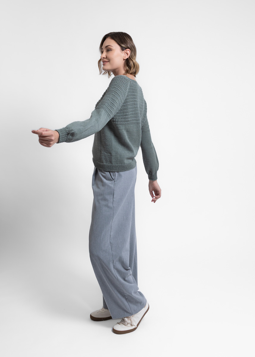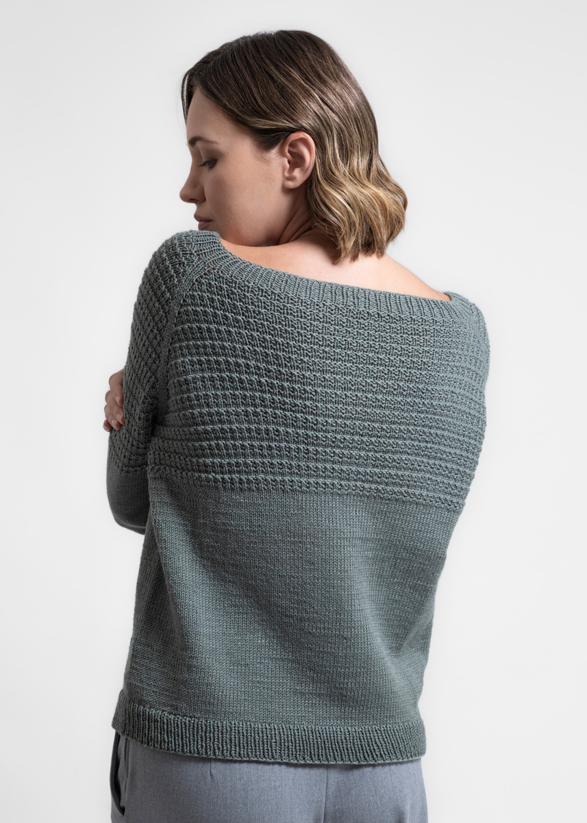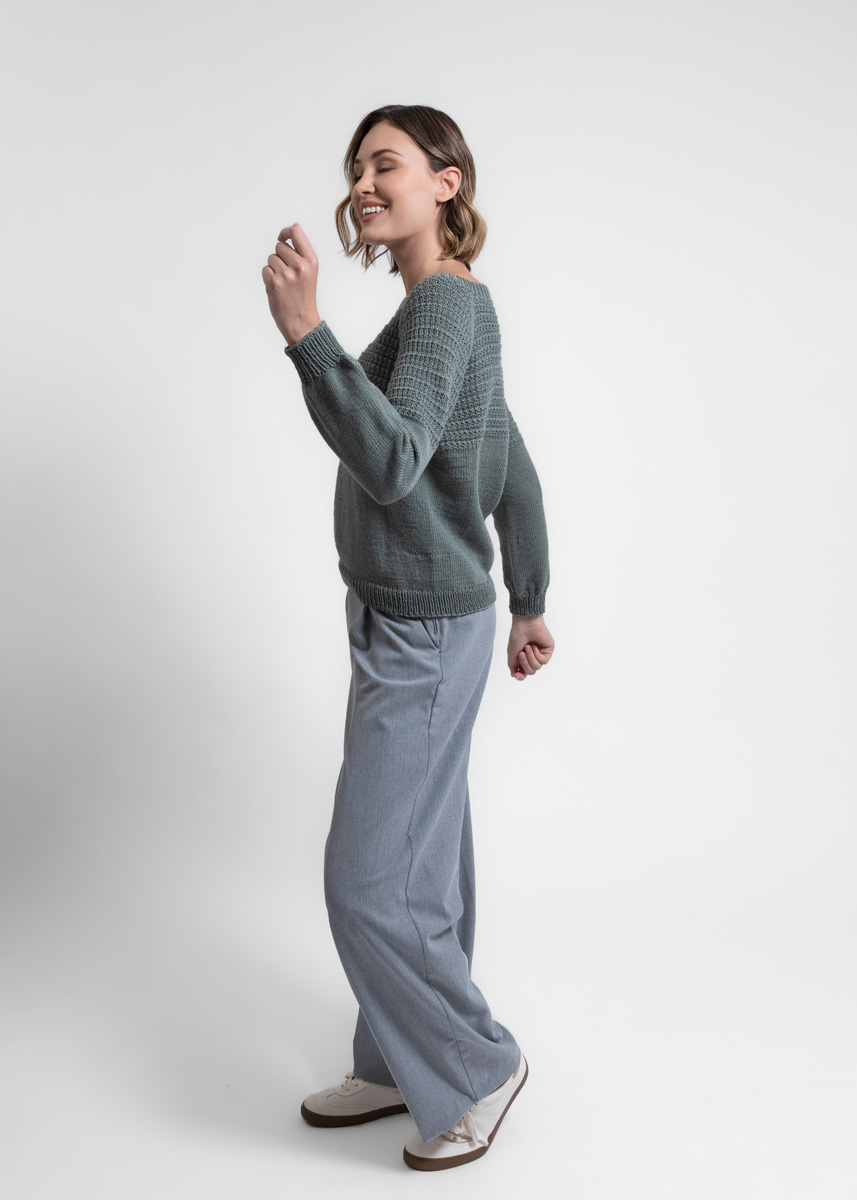 Lana Grossa COOL WOOL 100 % ren ny uld merino Løbelængde: ca. 160 m / 50 g • 400 (450 - 450 - 500 - 500 - 550) g sivgrøn (farve 2079) • Strikkepinde nr. 3,5 / 40 og 80 • Strikkepinde nr. 4 / 40, 60 og 80 cm • Strømpepinde nr. 3,5 og 4 • Maskemarkører [MM]