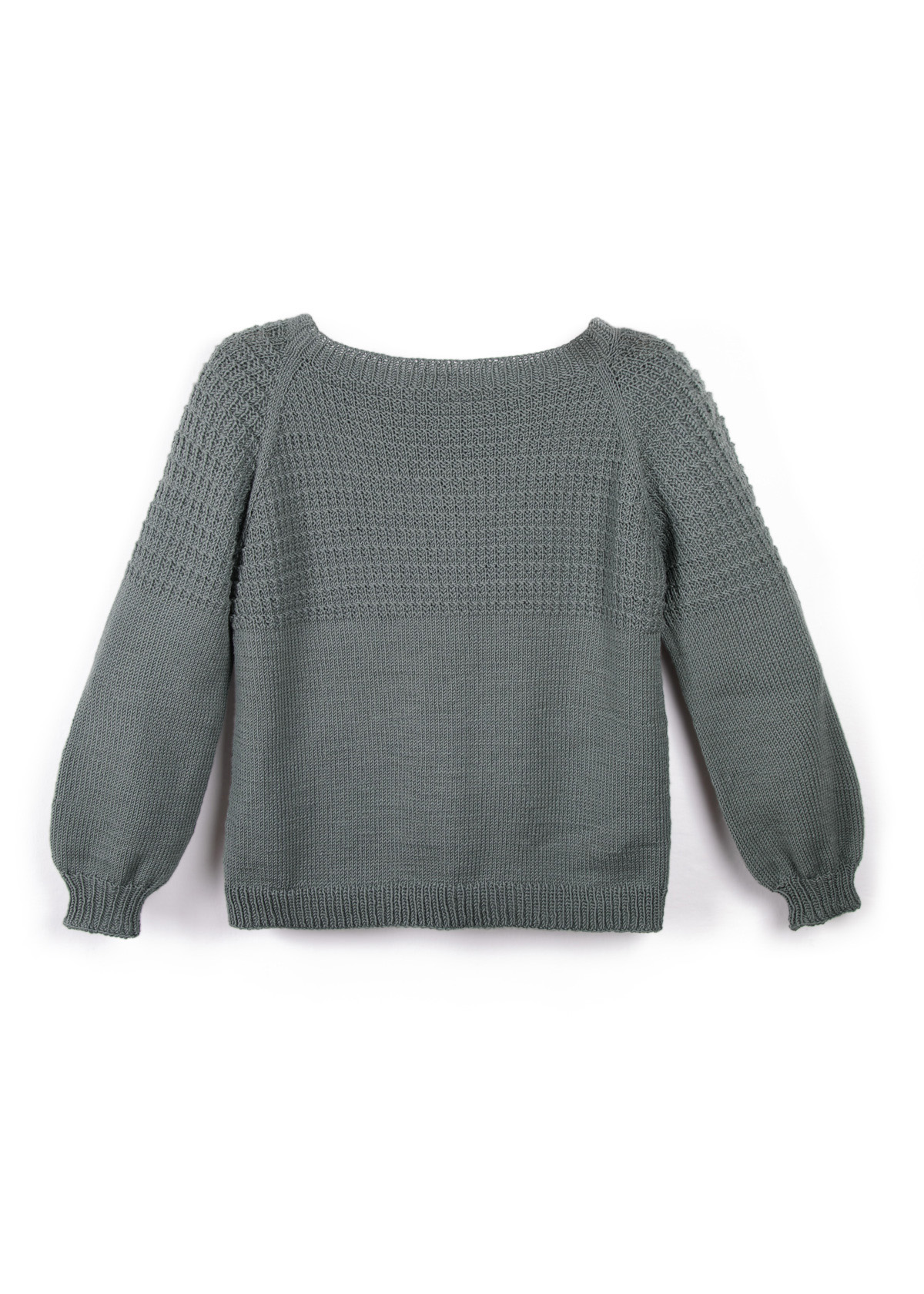 Pulloveren strikkes sømløst i ét stykke fra top til bund. Modellen har en samlet længde på 54 (56 - 58 - 60 - 62 - 64) cm og en brystoverbredde på 10 cm ved 80 cm brystomkreds (10 cm ved 88 cm brystomkreds - 10 cm ved 96 cm brystomkreds - 10 cm ved 104 cm brystomkreds - 10 cm ved 116 cm brystomkreds - 10 cm ved 128 cm brystomkreds).