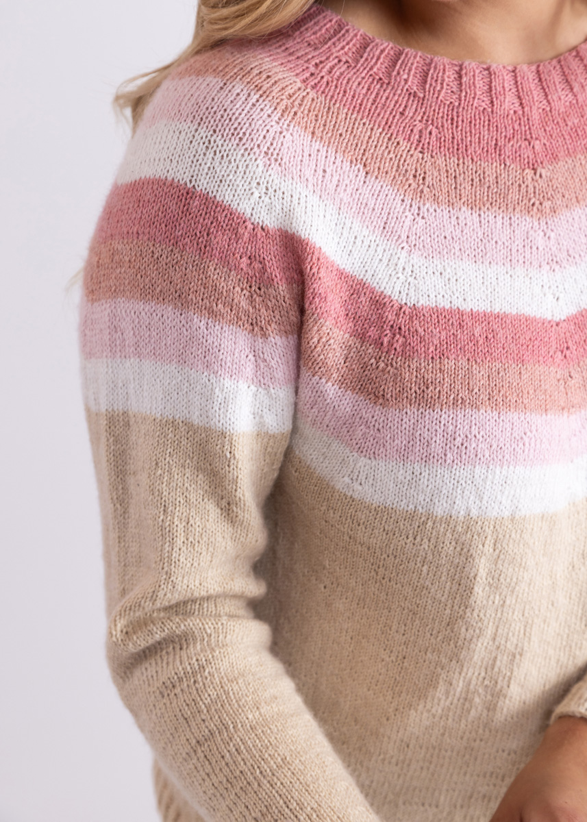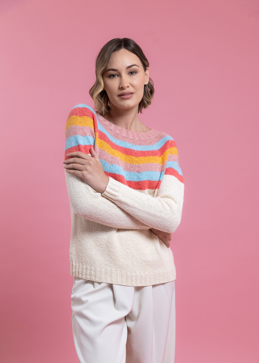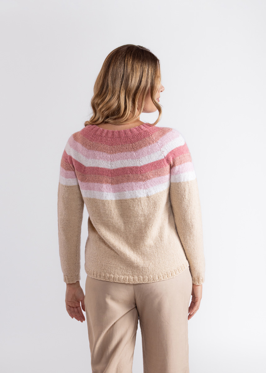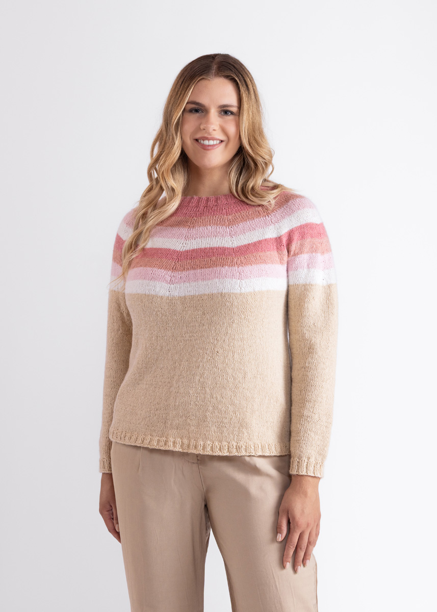 Pulloveren strikkes sømløst i ét stykke ovenfra og ned. Modellen har en samlet længde på 55 (57 - 59 - 61 - 63 - 65) cm og har en brystvidde som er 14 cm større end en brystomkreds på 80 cm (14 cm større end en brystomkreds på 88 cm - 14 cm større end en brystomkreds på 96 cm - 12 cm større end en brystomkreds på 104 cm - 14 cm større end en brystomkreds på 116 cm - 14 cm større end en brystomkreds på 128 cm).