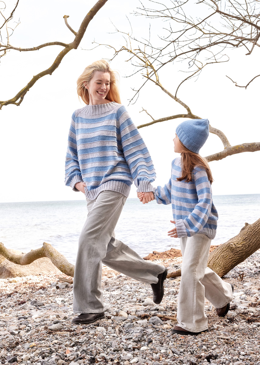 Materiale: Lana Grossa Cool Wool Big Mélange (100% ren ny uld (merino), LL = ca. 120 m/50 g), 400 (450 - 450 - 500) g i lysegrå melange (farve 616) og 300 (350 - 350 - 400) g i lyseblå melange (farve 1620). En rundpind på 60 cm og en 120 cm samt Strømpepinde, I størrelse 4 mm; en rundpind på 40 cm, en på 60 cm, en på 80 cm, en på 100 cm og en på 120 cm, størrelse 4,5 mm. To ekstra pinde til at holde maskerne, 9 MM.