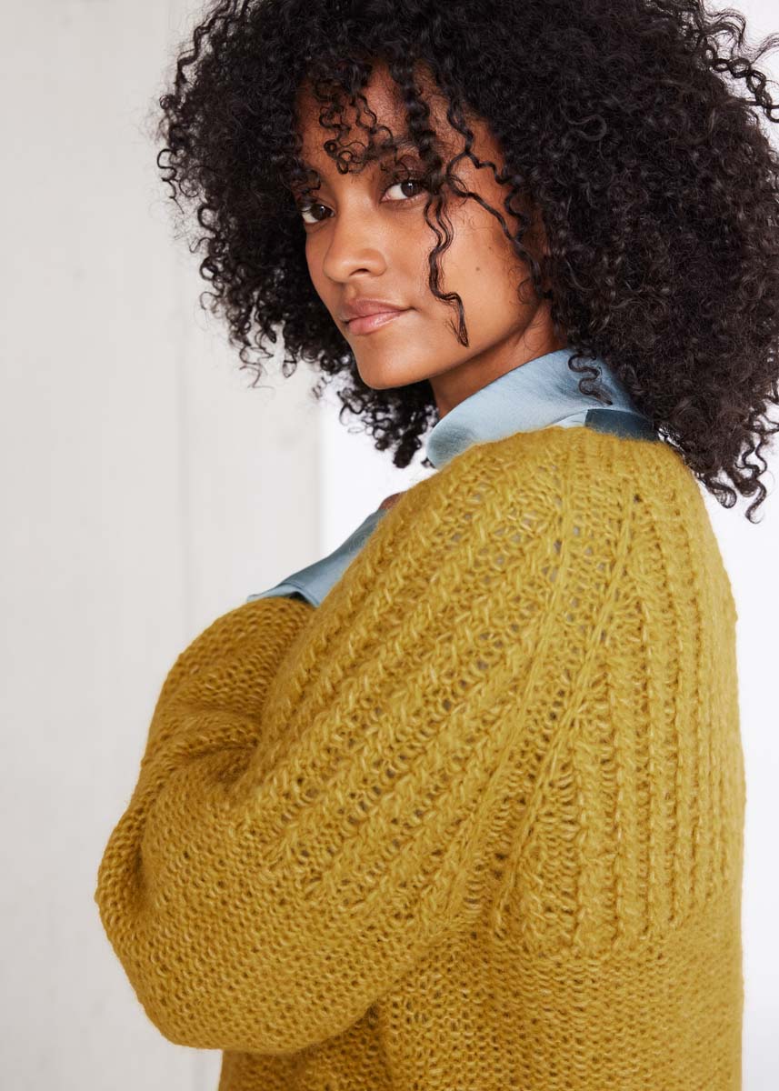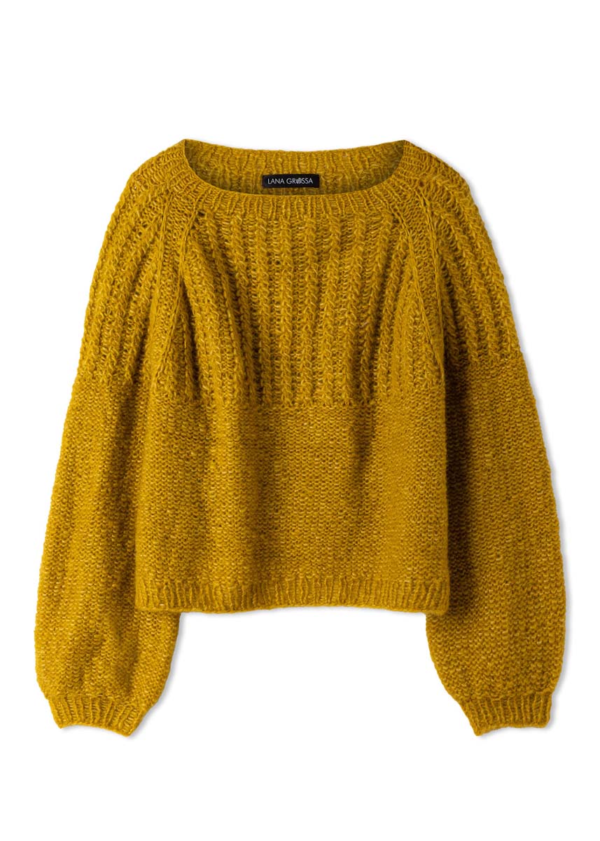 Lana Grossa Alpaca Air II (50% (baby) alpakka, 27% polyamid, 14% bomull, 9% ny ull (merino), løpelengde = ca. 140 m/50 g), 250 (300 - 350) g i safrangul (farge 22); 40 cm lange, 60 cm lange, 80 cm lange og 1 100 cm eller 120 cm lange rundpinner nr. 6; 1 100 cm eller 120 cm lang rundpinne nr. 5 og 5 settpinner nr. 5; 9 maskemarkører (MM); 2 hjelpepinne til hvilende m.